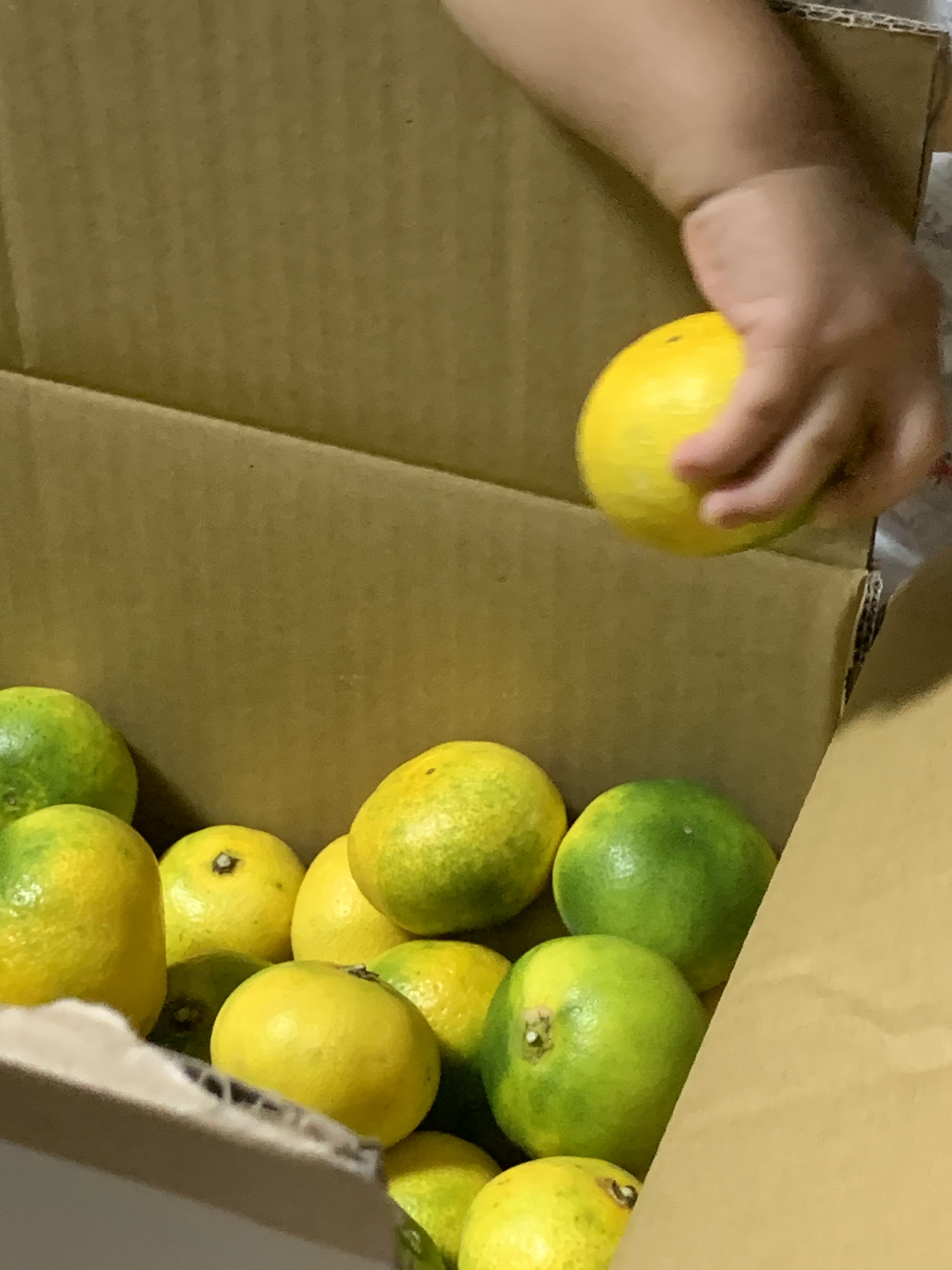 1歳半の娘にも食べさせると、とても気に入ったようで、みかんを抱えて大事そうに持っていたり、みかん屋さんごっこをしていました。