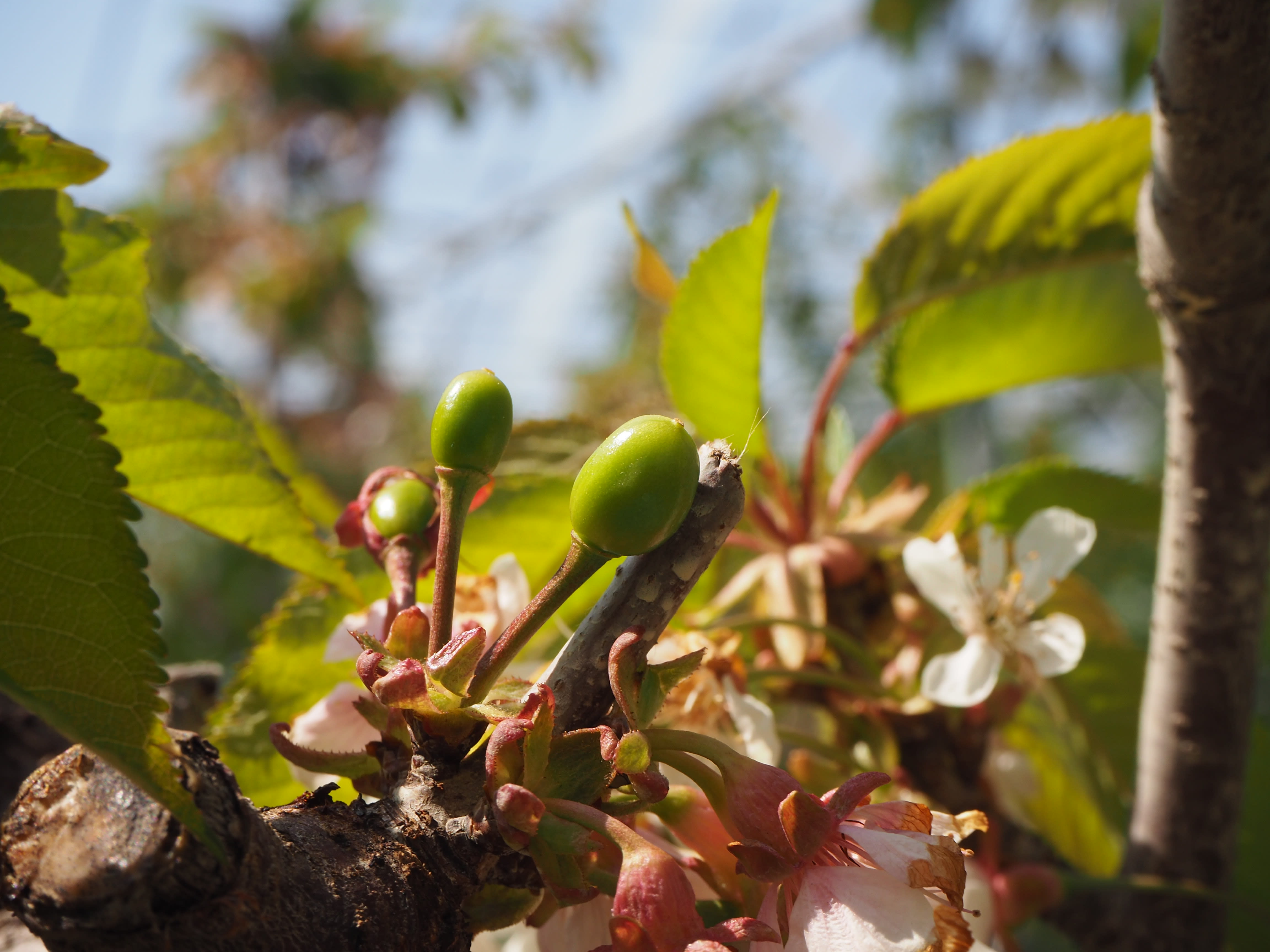 早生のさくらんぼ「紅さやか」の赤ちゃん発見!ちょっと前に受粉したはずなのにもう膨らんでいます!