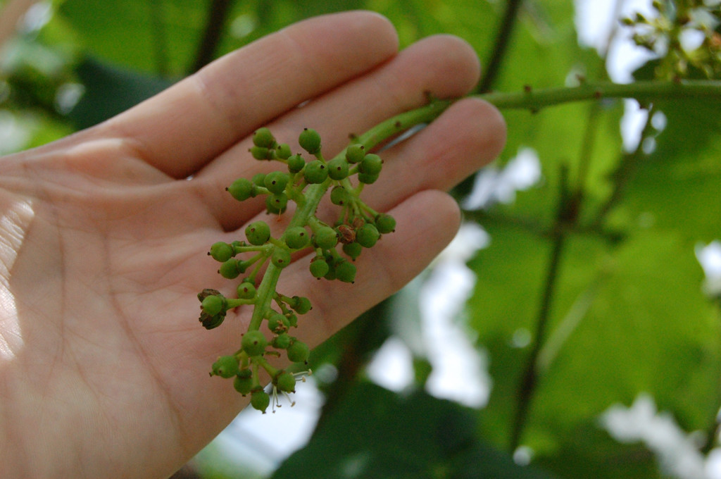 満開から数日後の房は小さなぶどうの粒になってきました。小指の先ほどだった房の長さも数日でどんどん伸びてきました。