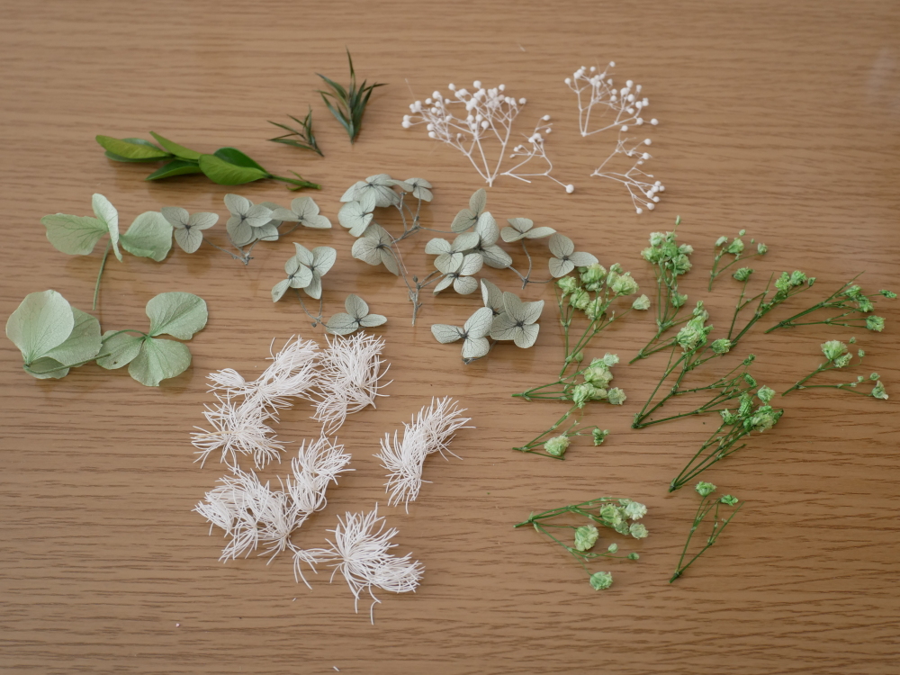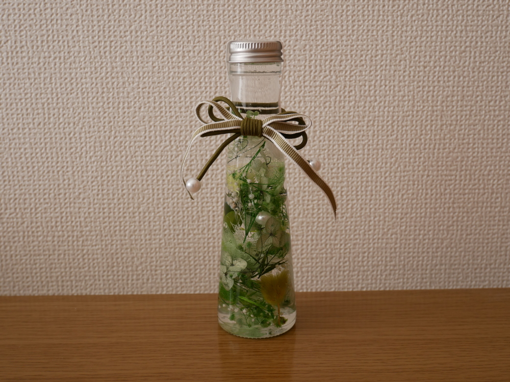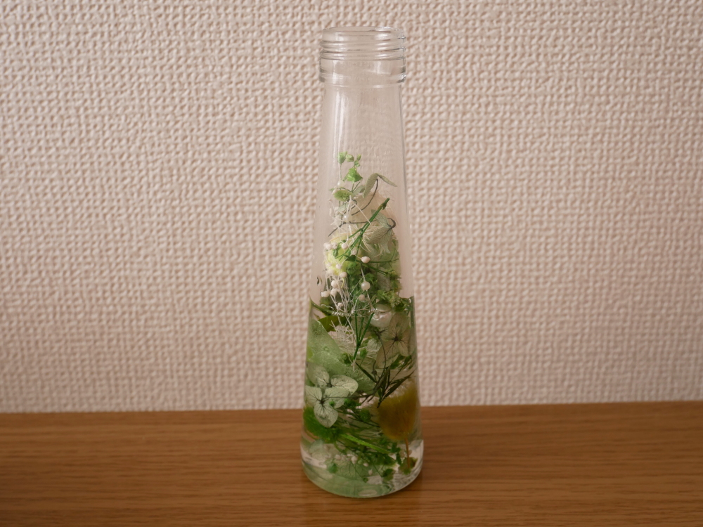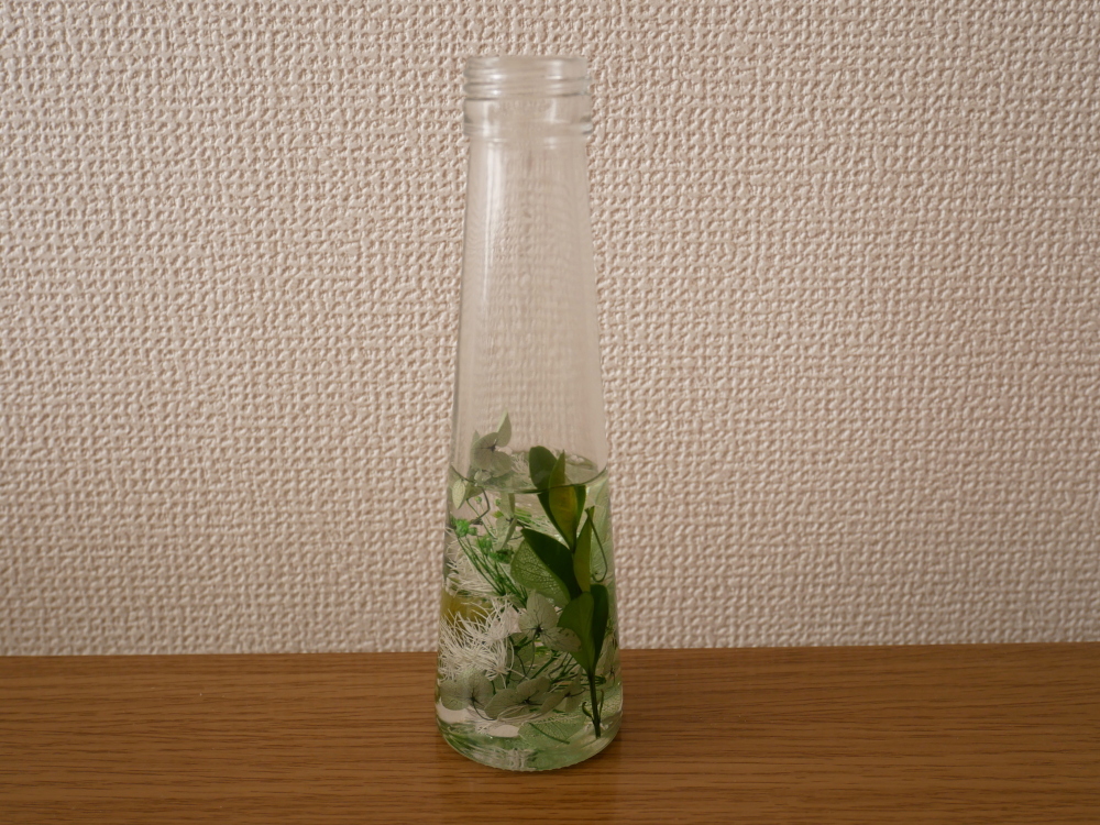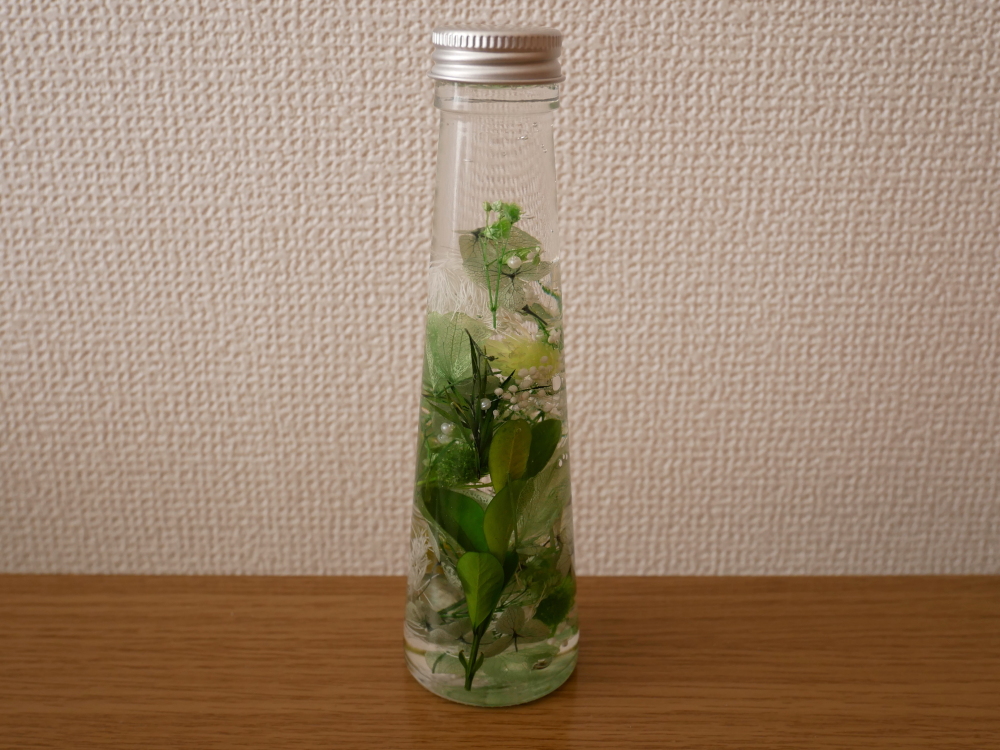 記念すべき一回目のハーバリウムづくりは、円錐型のボトルと緑色の花材で行います。