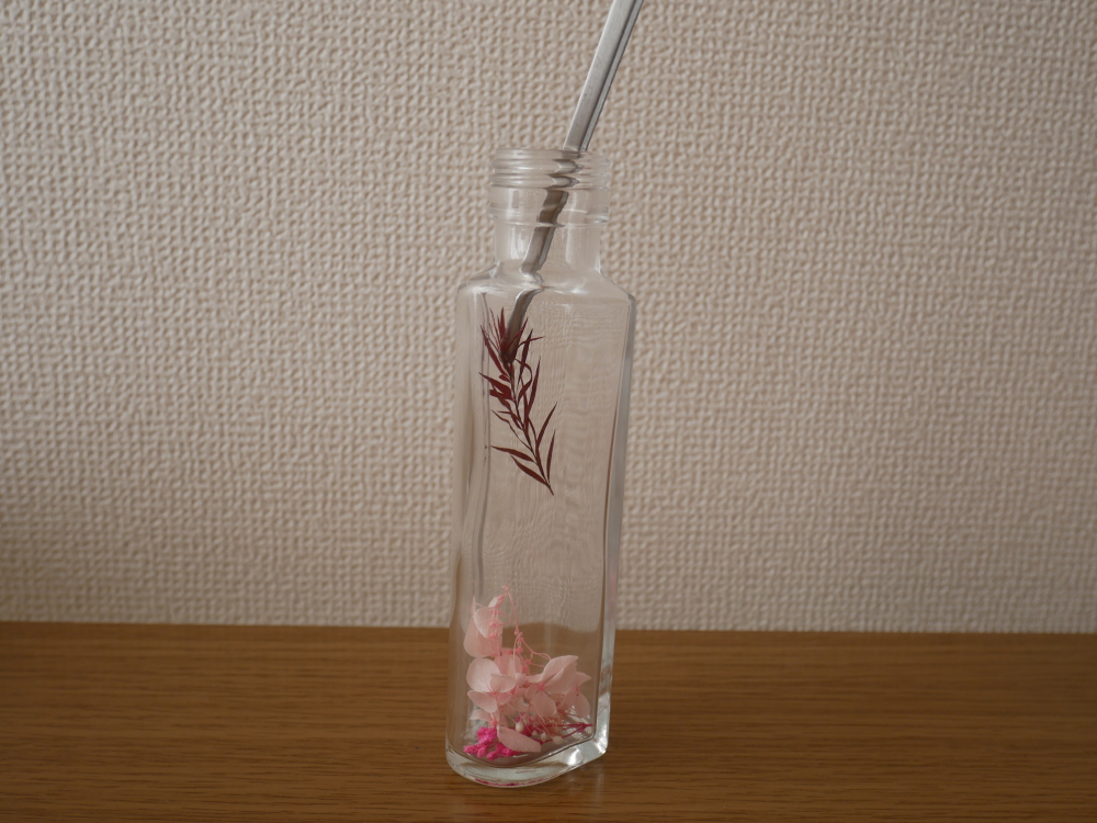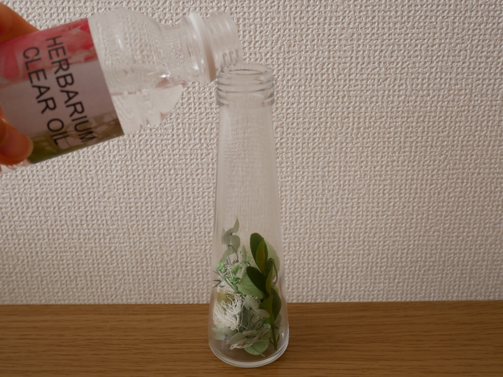 オイルの重みで沈んだかもしれません。オイルは花材がずれないように瓶の壁に沿ってゆっくり注ぎ、沈んだらピンセットで引き上げて直します。オイルと花材を交互に少しずつ入れるのも良いです