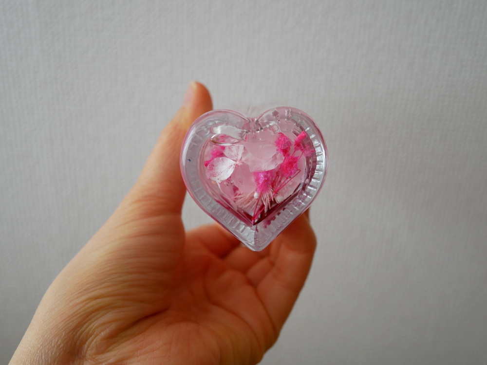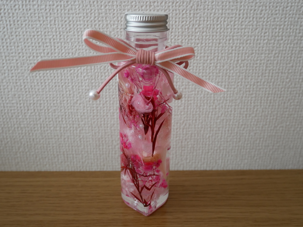 一回目の反省とアドバイスを生かして、もう一度挑戦してみます。今度は、ハート型のボトルとピンク色の花材です。