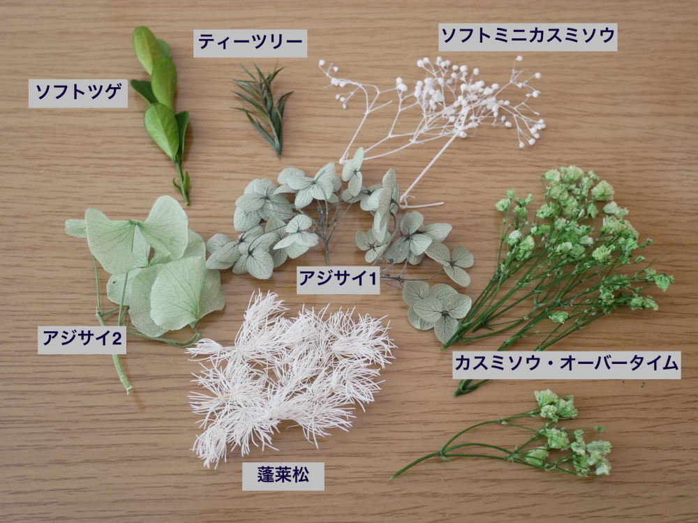 ソフトツゲ、ティーツリー、カスミソウ2種、アジサイ2種、蓬莱松(ほうらいまつ)
