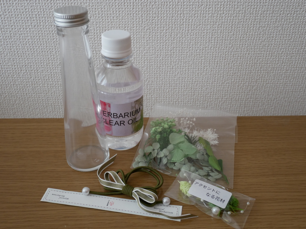 花材、ガラスボトル、専用オイル、ピンセット、蓋に貼るシール、飾り用のリボンです。
