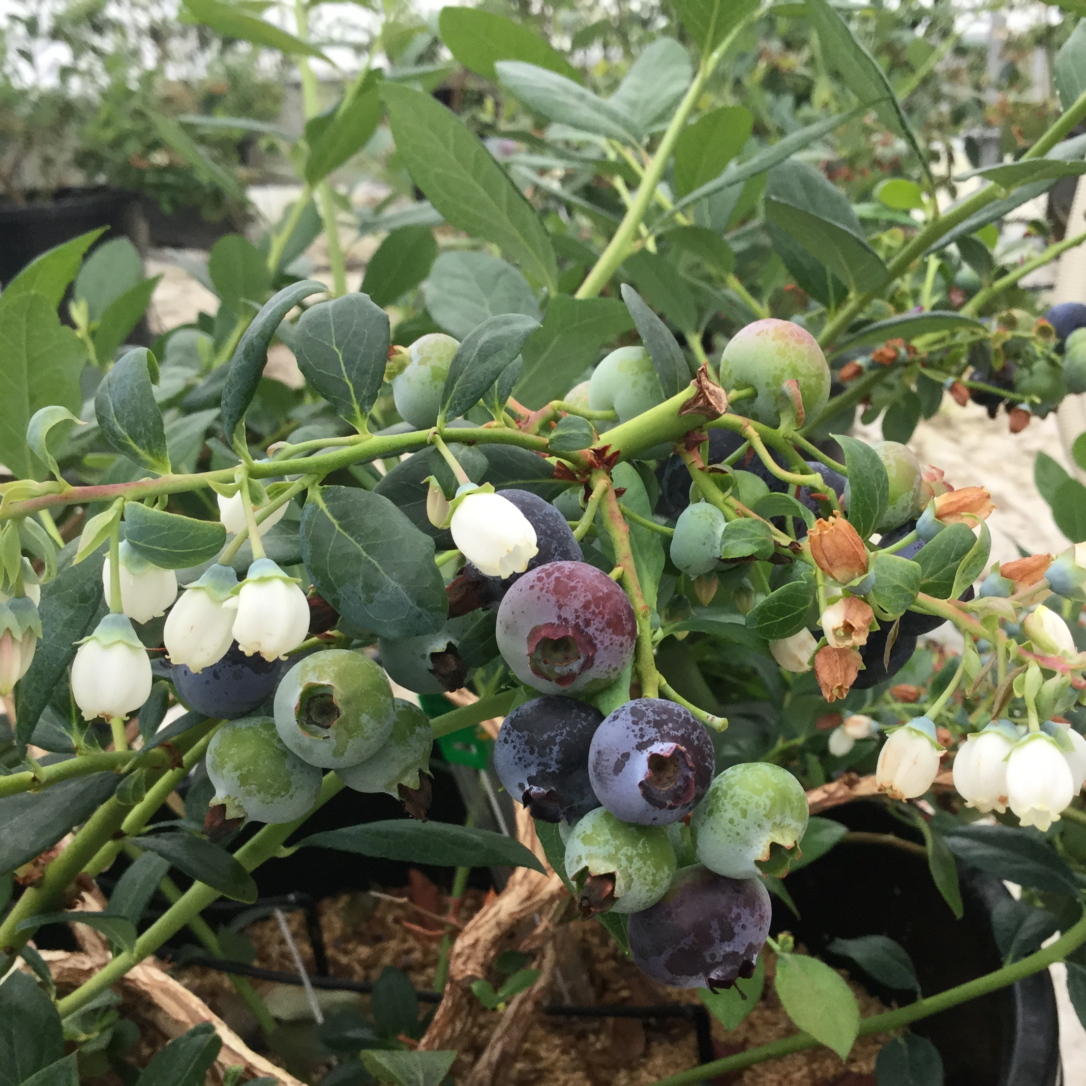 こんなにたくさん実をつけて花も次々咲かせて、ブルーベリーの木はとても元気に生育しています。