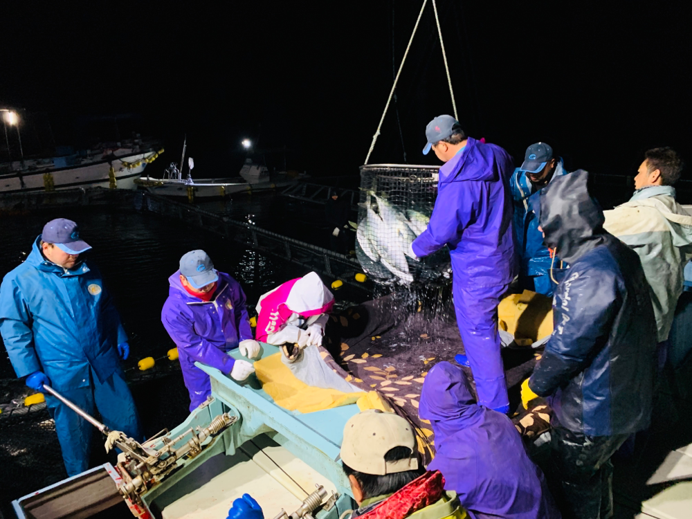 そう、今日は鰤の出荷。漁師仲間が集まり、スポットライトを浴びた船上は勇ましい掛け声と魚の暴れる音が鳴り響く。