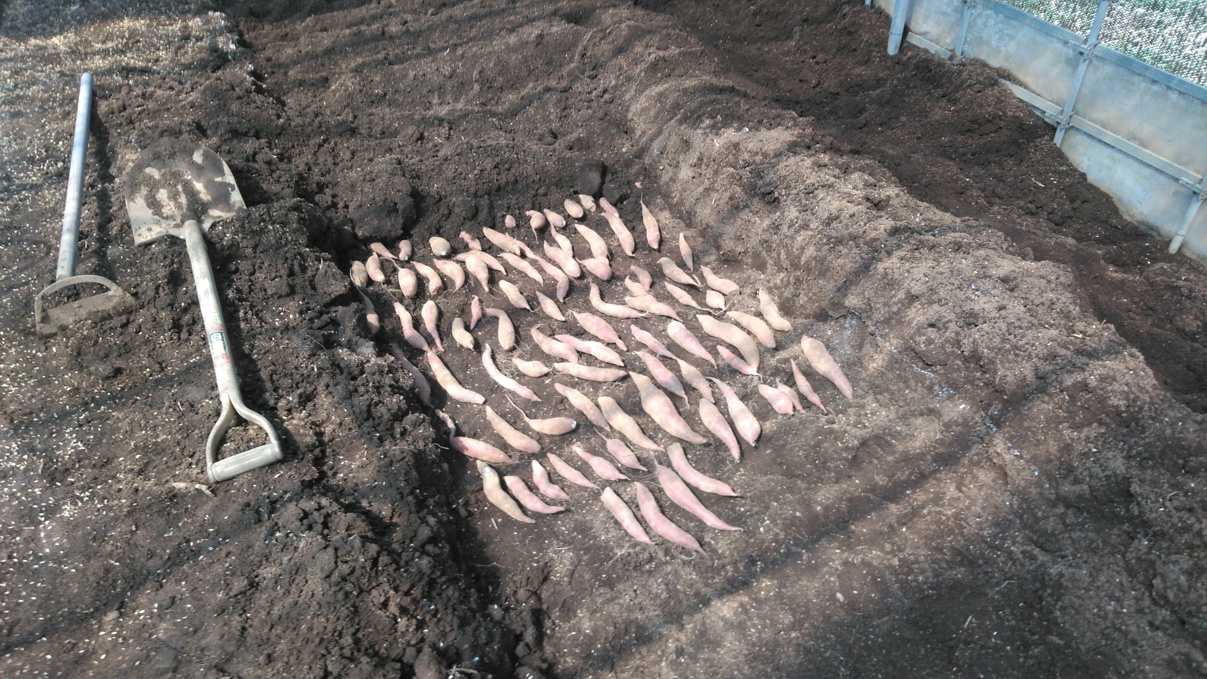 種芋を伏せ込みました。ここから出てきた芽を採って、苗として、畑に植え付けます。