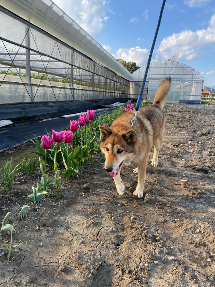 今日は、家から愛犬『コン』を連れてきて、ハウスの周りを散歩しました♪