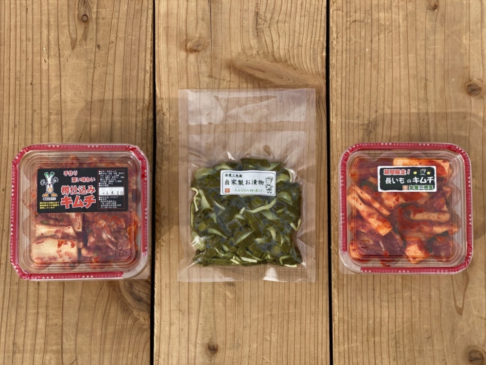 白菜キムチと胡瓜の押漬、長いもキムチの3種が