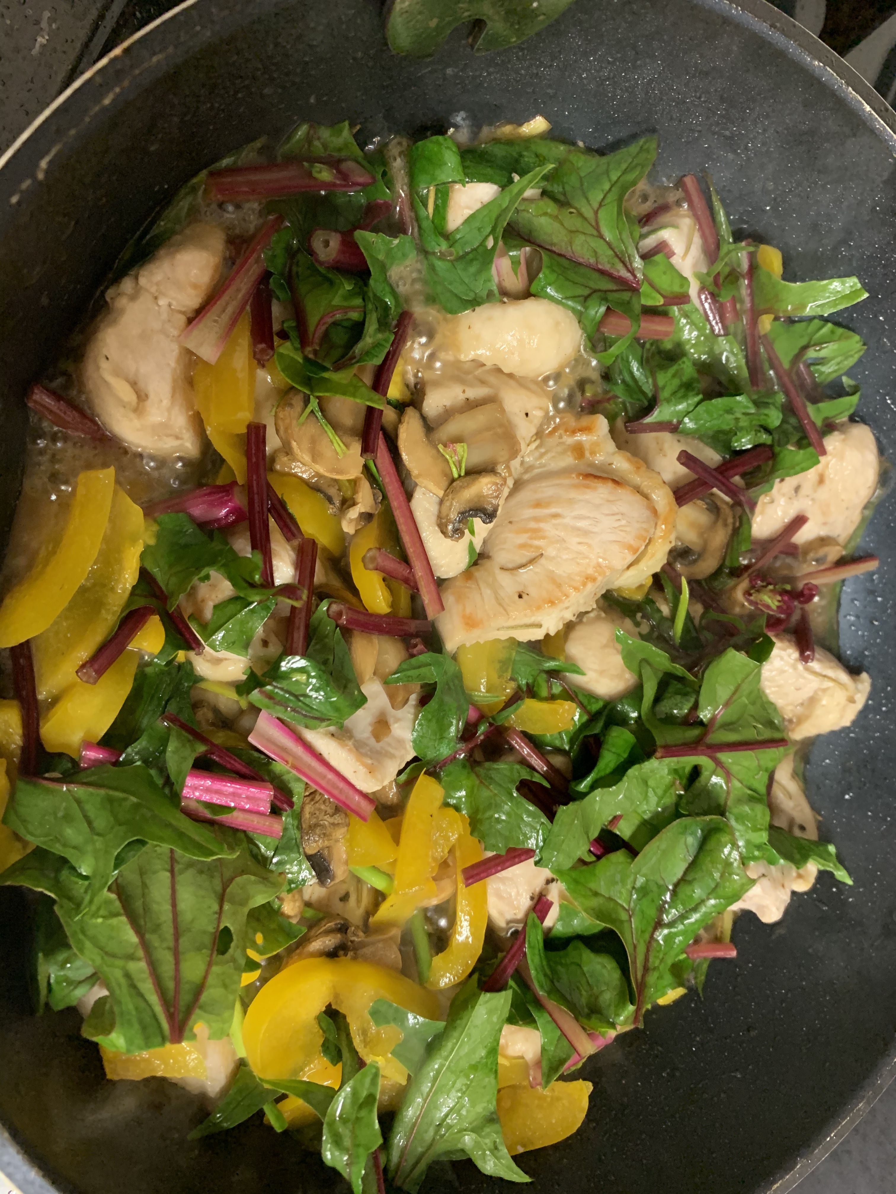 今日はおまけのローズマリーと新玉ねぎの葉、ニンニクの芽、赤軸ほうれん草を使い、鶏肉の炒め物を作りました。ローズマリーの香りと新鮮な野菜のそれぞれの味が重なり合い美味しい❗️黄パプリカ、ブラウンマッシュも加え、彩りも楽しく食べれました。夏野菜も楽しみです👍