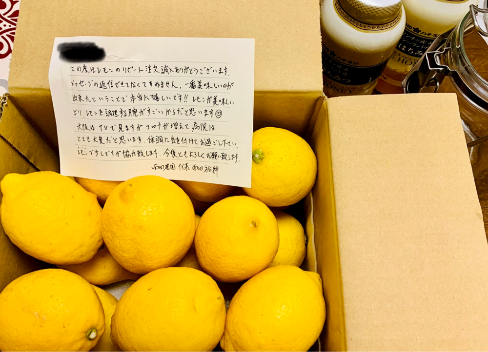 医療従事者のannaさんの元にレモンと一緒に届いたのは、農家の西田さんからの手書きメッセージ。「涙が止まりませんでした」との言葉に、懸命に職責を果たそうとする医療現場の雰囲気が伝わってくるようです。