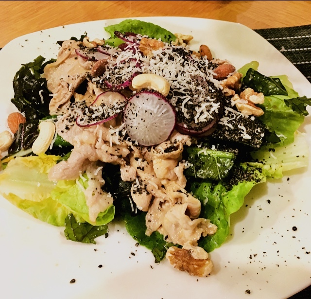 豚しゃぶと黒胡麻&ナッツとチーズを削って乗せていますが、次は塩とオイルだけでいこうかなーとワクワクしています!