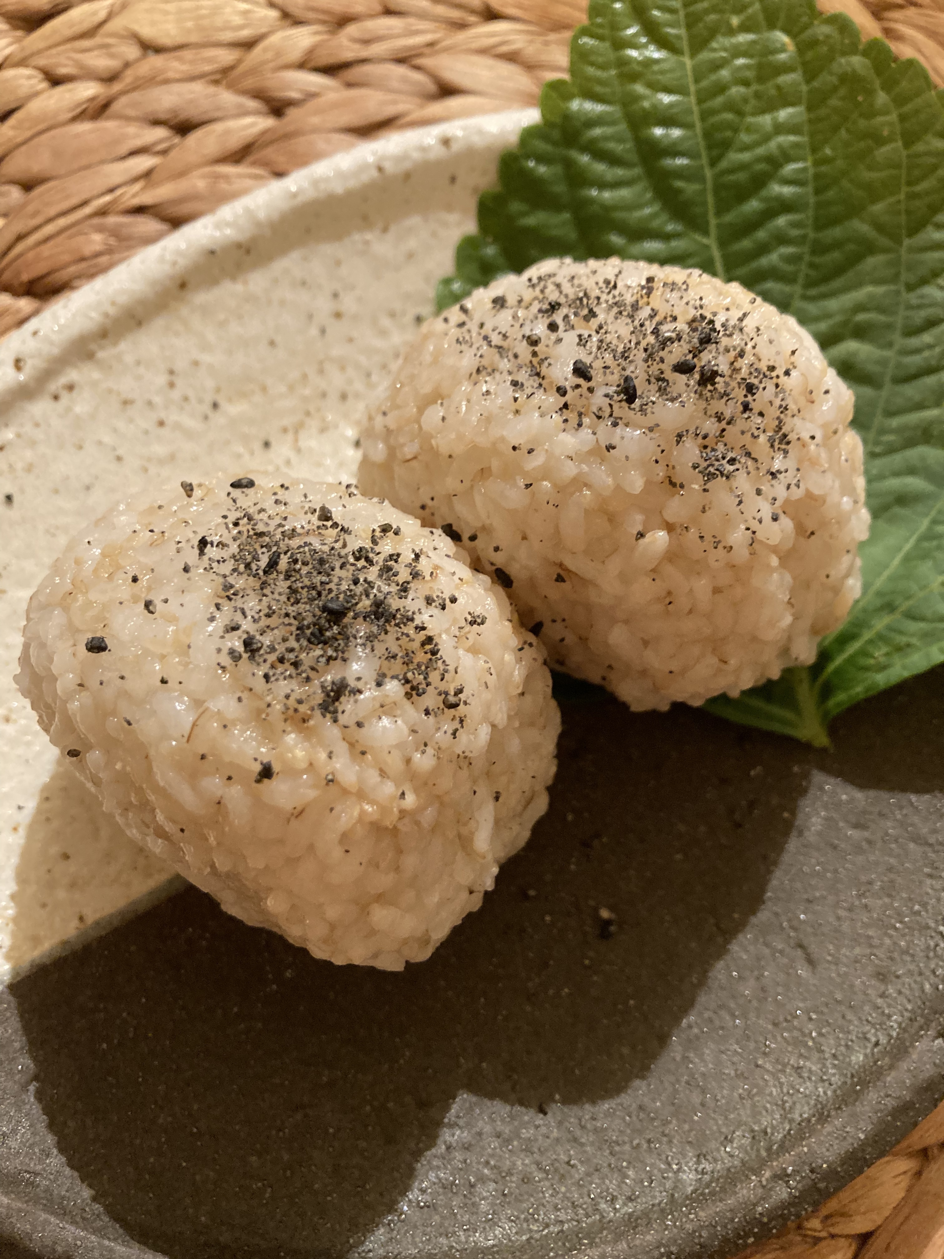 白米に近い玄米、とてもいいとこ取りでお米の甘さも感じ、まずは塩おむすび🍙にしエゴマの葉で巻き