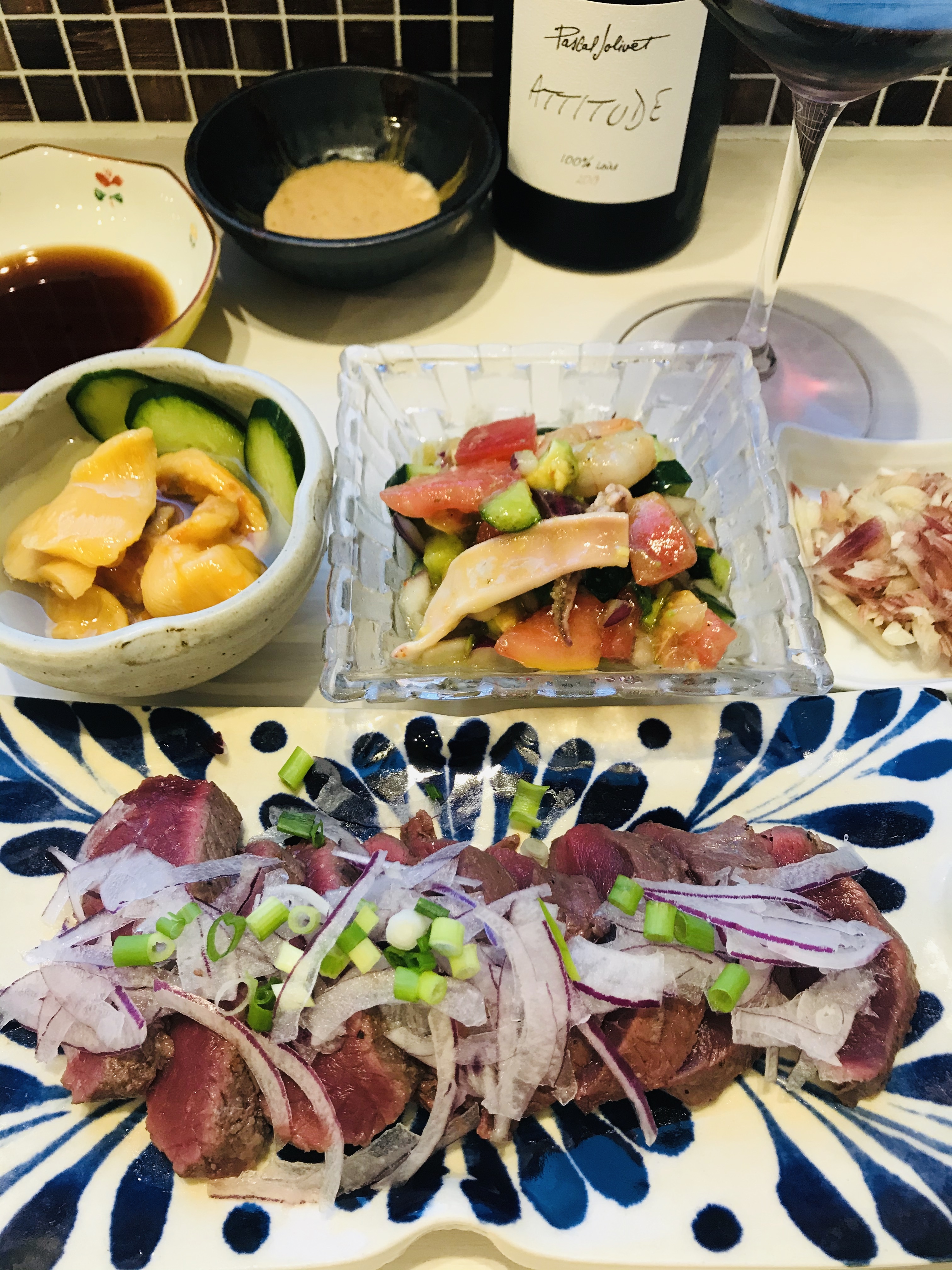 鹿肉リピーターさんとお見受けしました。メインのお皿には、鮮やかな赤色の鹿肉に和の薬味が満載。サイドメニューもみな彩りよく、食欲をそそられます💮