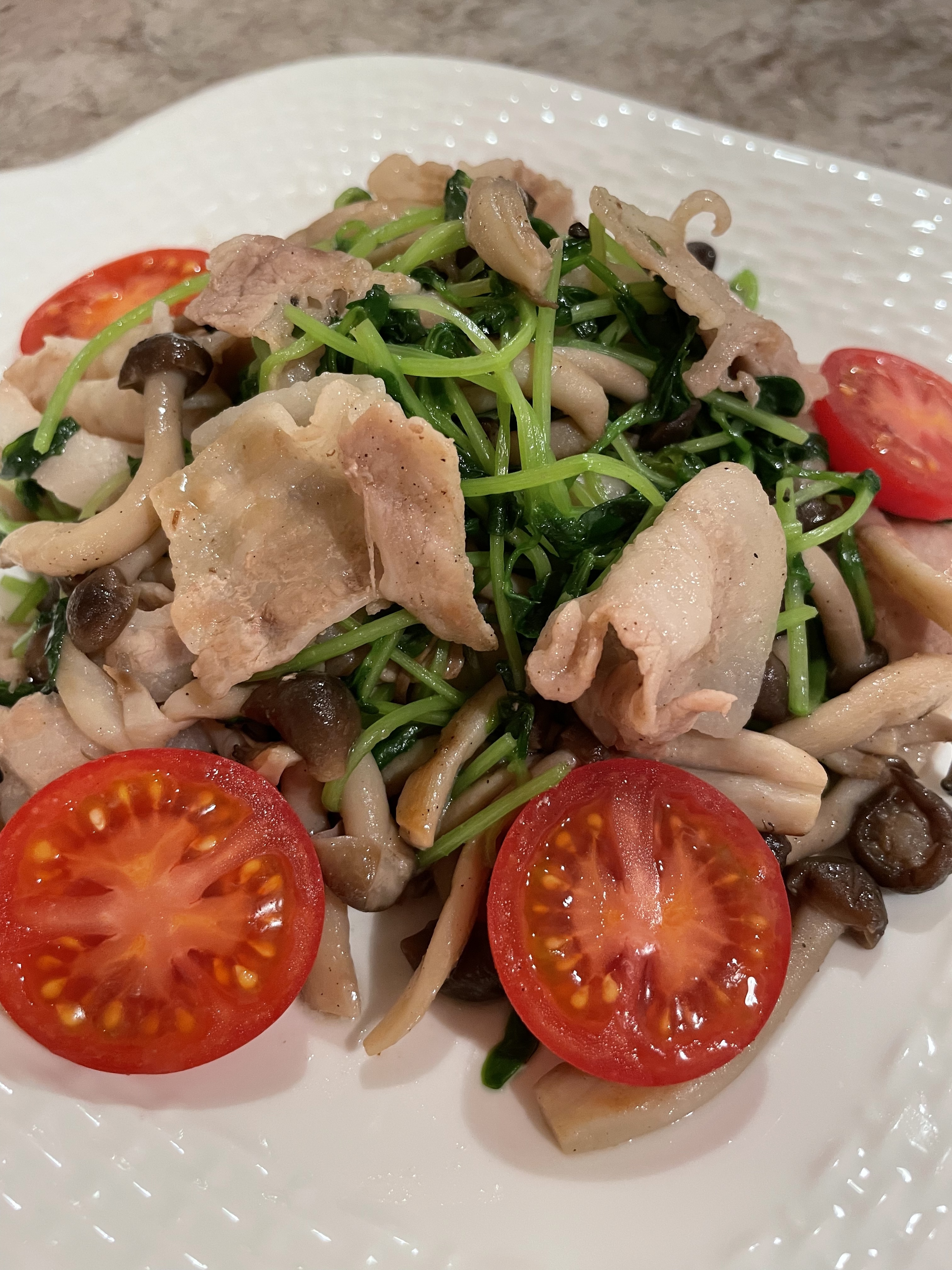 初の美白豚(バラ肉)を使って 「豆苗と豚肉の炒めたん」を作りました。かさ増しにしめじも投入~笑
