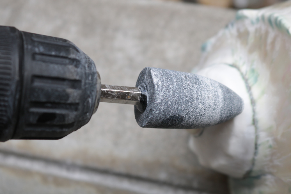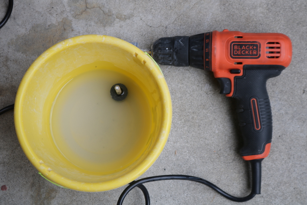 電動ドリルに砥石を装着して、広めの面を削ってみたところ、手作業と比べて楽ではありますが、劇的に楽になるわけではありませんでした。一方、均等な力で表面を整えられるので、細かい傷消しには便利でした。
