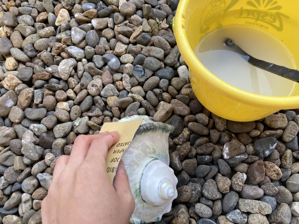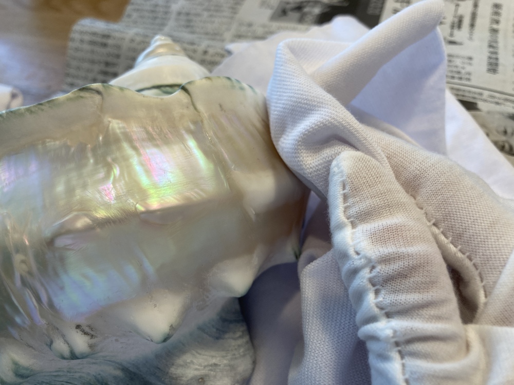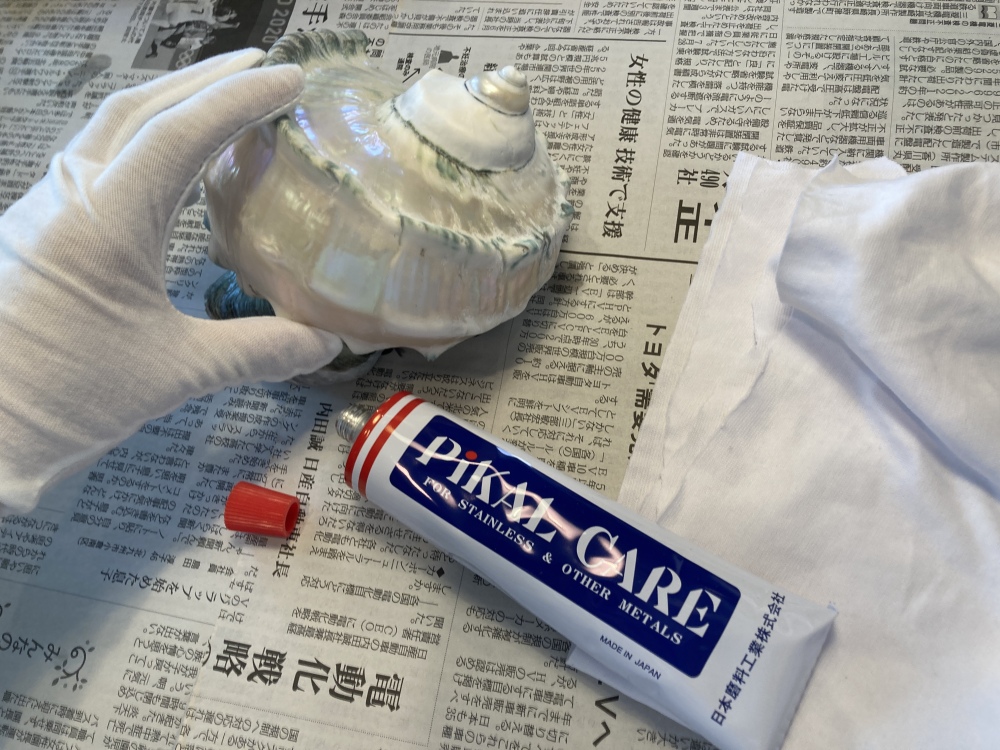 ここで試しに、研磨剤で磨いてみることに。貝殻をよく水洗いし拭きあげた後に、研磨剤を塗布し、乾いた布で磨きます。