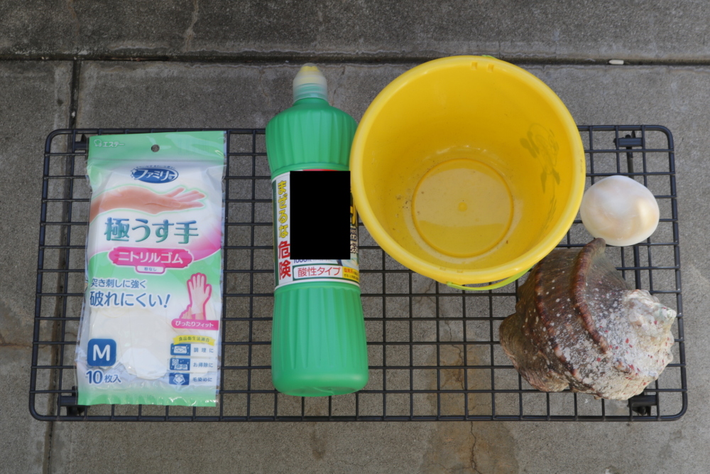 作業を開始したのは、木枯らしの吹く晩秋のことでした。まずは第一の工程、貝殻の表層を溶かすための塩酸処理です。用意したのは、ゴム手袋と酸性タイプの洗剤、バケツ。