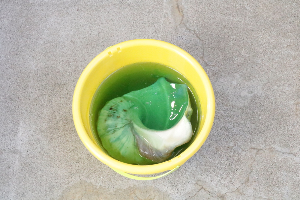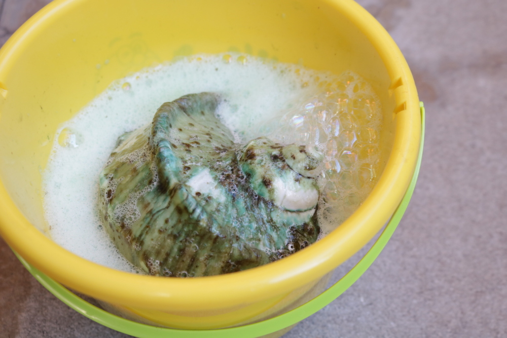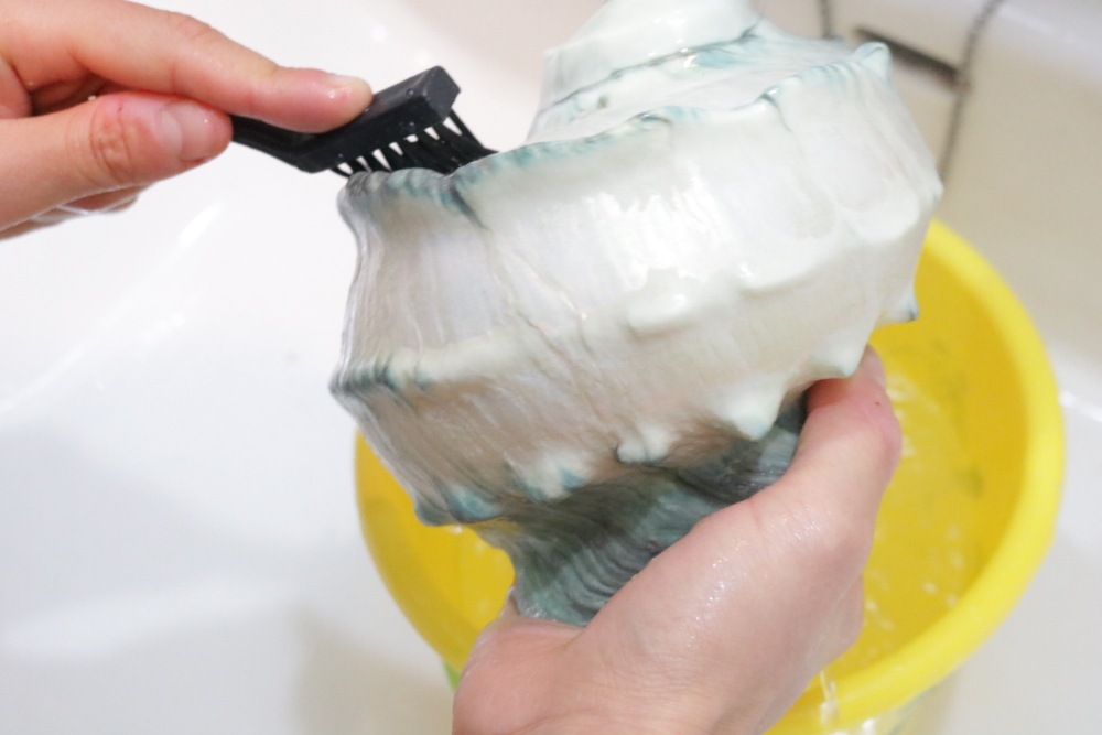 貝殻全体が浸る程度まで洗剤を入れ、まんべんなくくぐらせてしばらく経つと、貝殻の色味にも変化が現れはじめました。茶褐色だった表面は、一部がエメラルドグリーンのような色味に。このまま1日放置します。