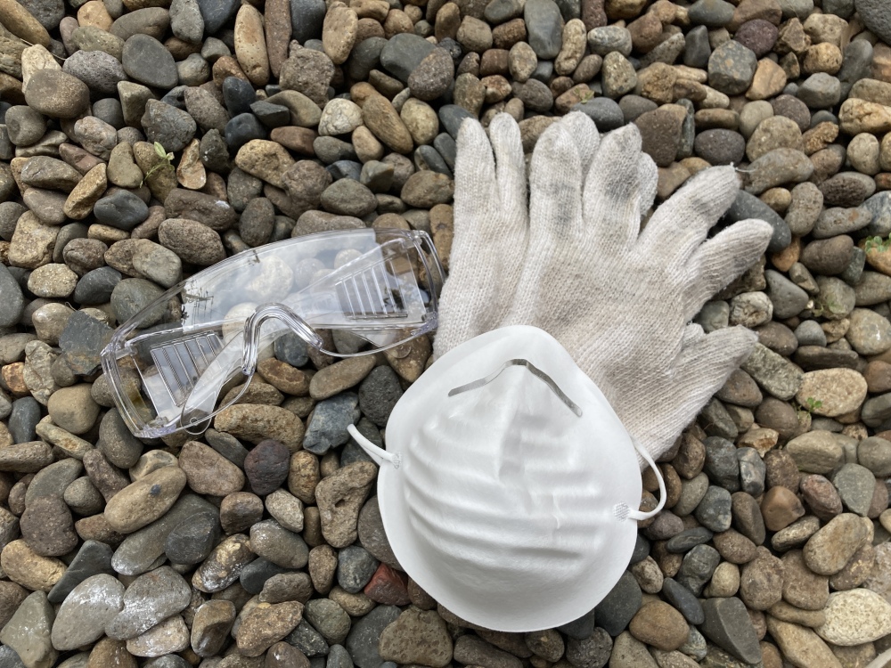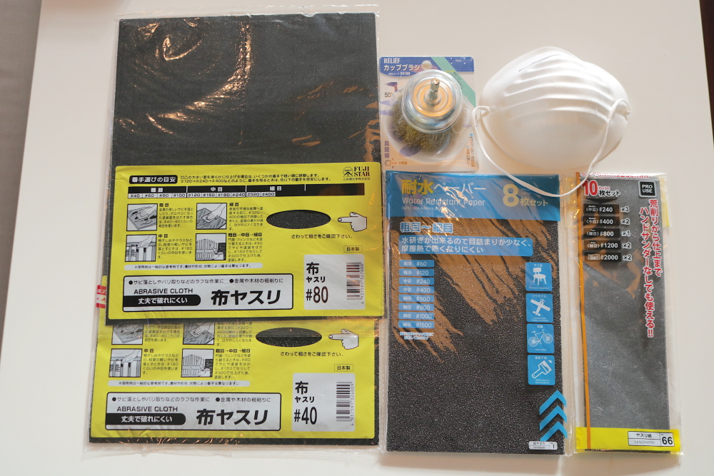 粉じん吸引を予防するための防じんマスクと安全メガネに、100円ショップで購入した紙ヤスリや耐水ペーパー各種です。