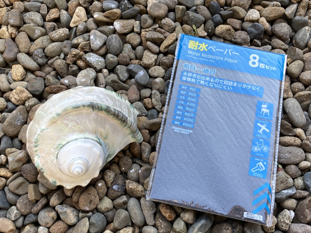 2回の漂白を終えたところで、本格的な研磨作業に入ります。削る作業に使う道具と言えば「ヤスリ」ですが、一体どんな道具が夜光貝に適しているのでしょう? とりあえず紙ヤスリから始めてみたところ——