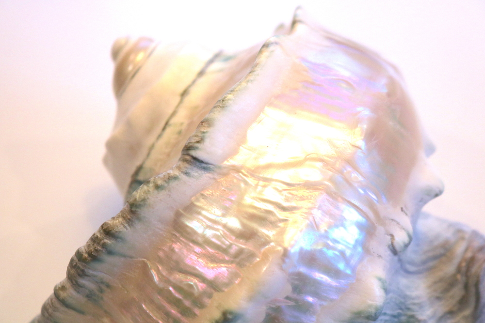 目を凝らすと白い部分の所々に虹色の光沢が。これが真珠層と呼ばれる部分のようです。光沢の無いマットな白地は石灰層です。石灰層の下に隠れていた真珠層が、部分的に露出してきたようですね。