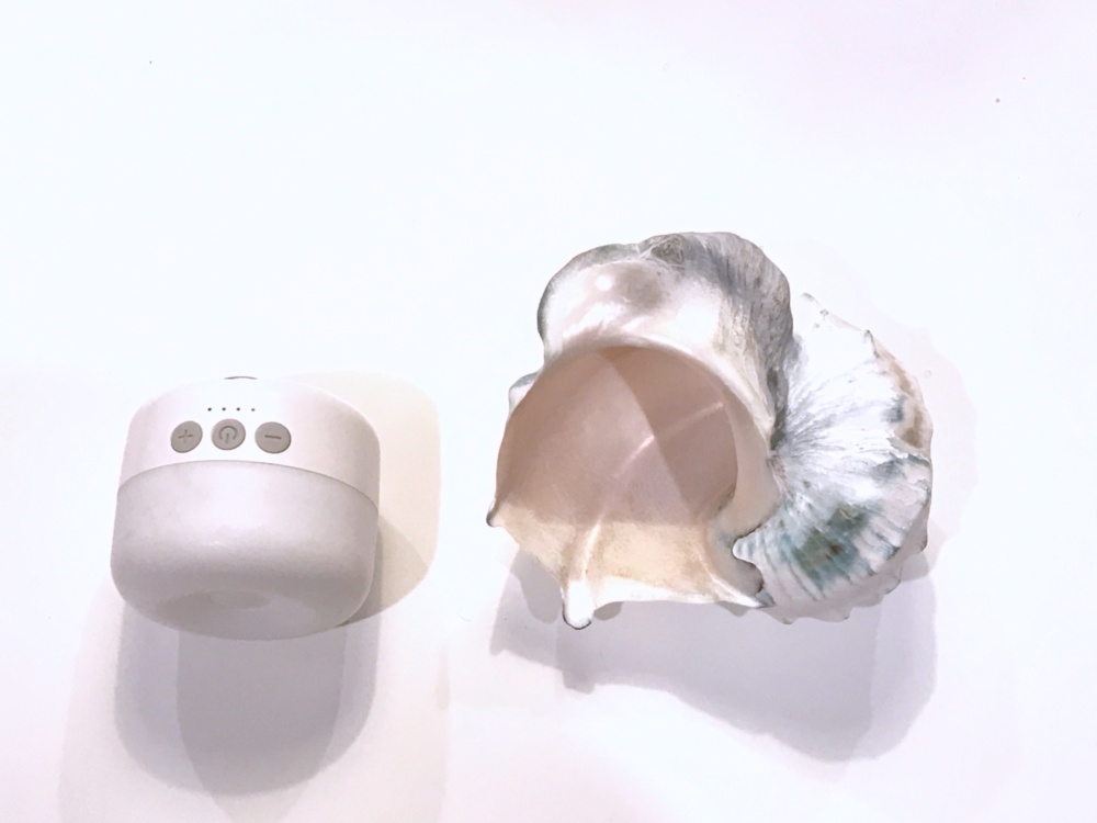 置いたままでも邪魔にならないものといえば、ランプ。充電式LEDライトを夜光貝の口にカポッとはめてみます。