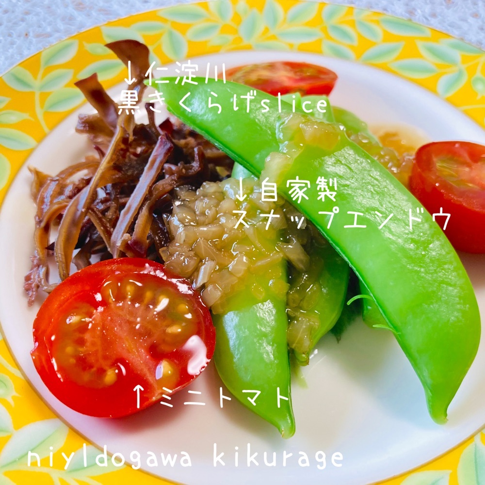 メニュー☝️😊 『仁淀川きくらげとスナップエンドウのサラダ』