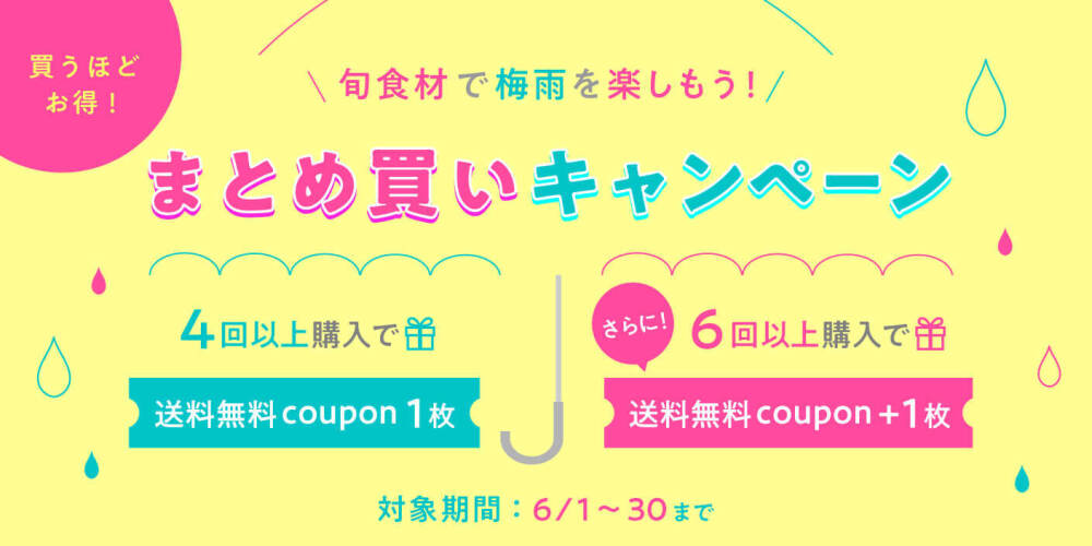 梅雨は日本の豊かな自然を育むために大切な季節ではありますが、雨模様の毎日だと気分は上がりにくいもの。そんな時こそ、ポケマルの旬食材で楽しく過ごしてほしい…❗という思いを込めて、ポケマルを沢山楽しんでくださった方のために、「送料無料クーポン」のプレゼントキャンペーンを開催します😁