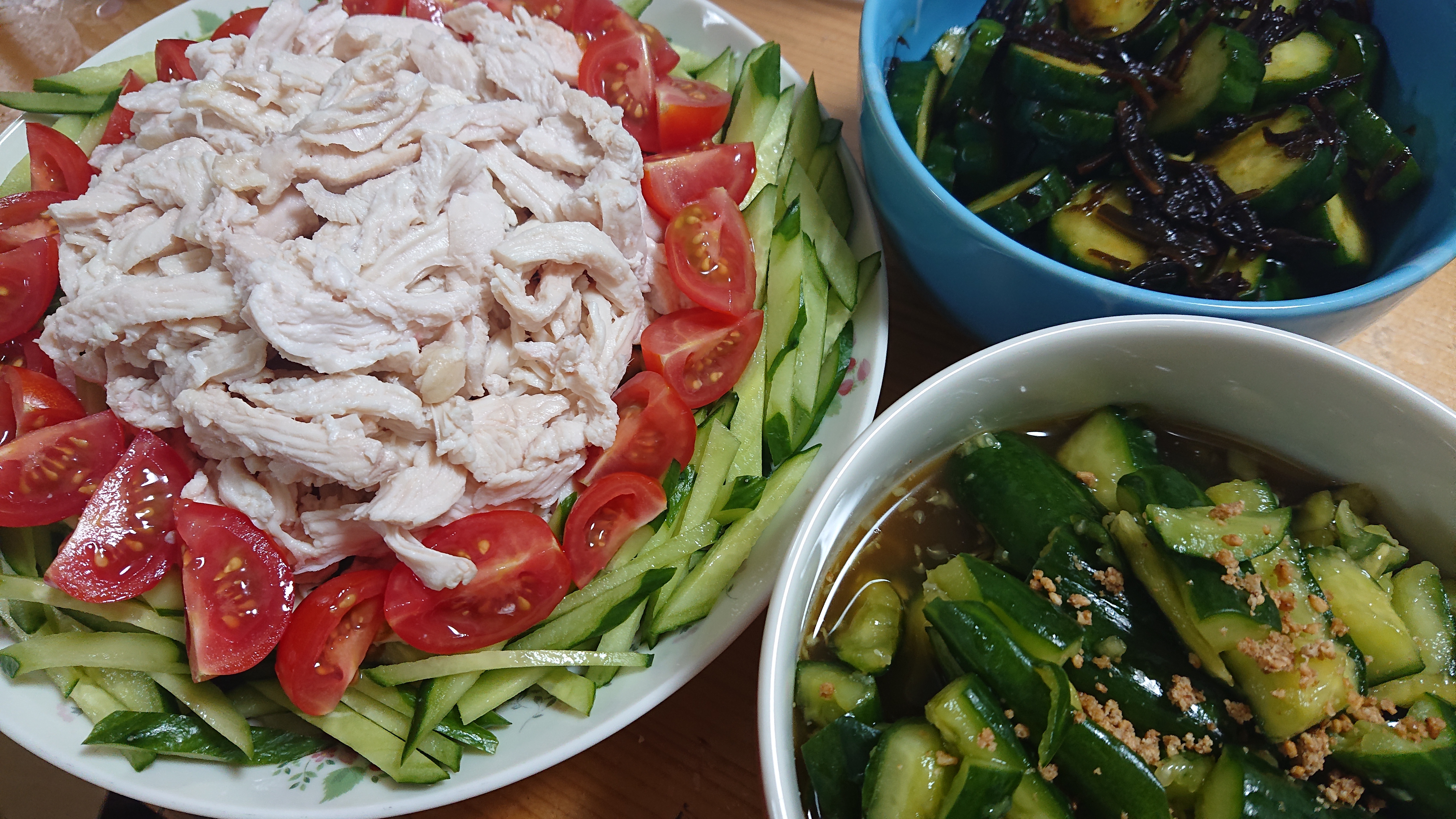 ゆで鶏の付け合わせ、きゅうりの塩昆布あえ、たたききゅうりをニンニク・醤油・お酢で即席漬け。
