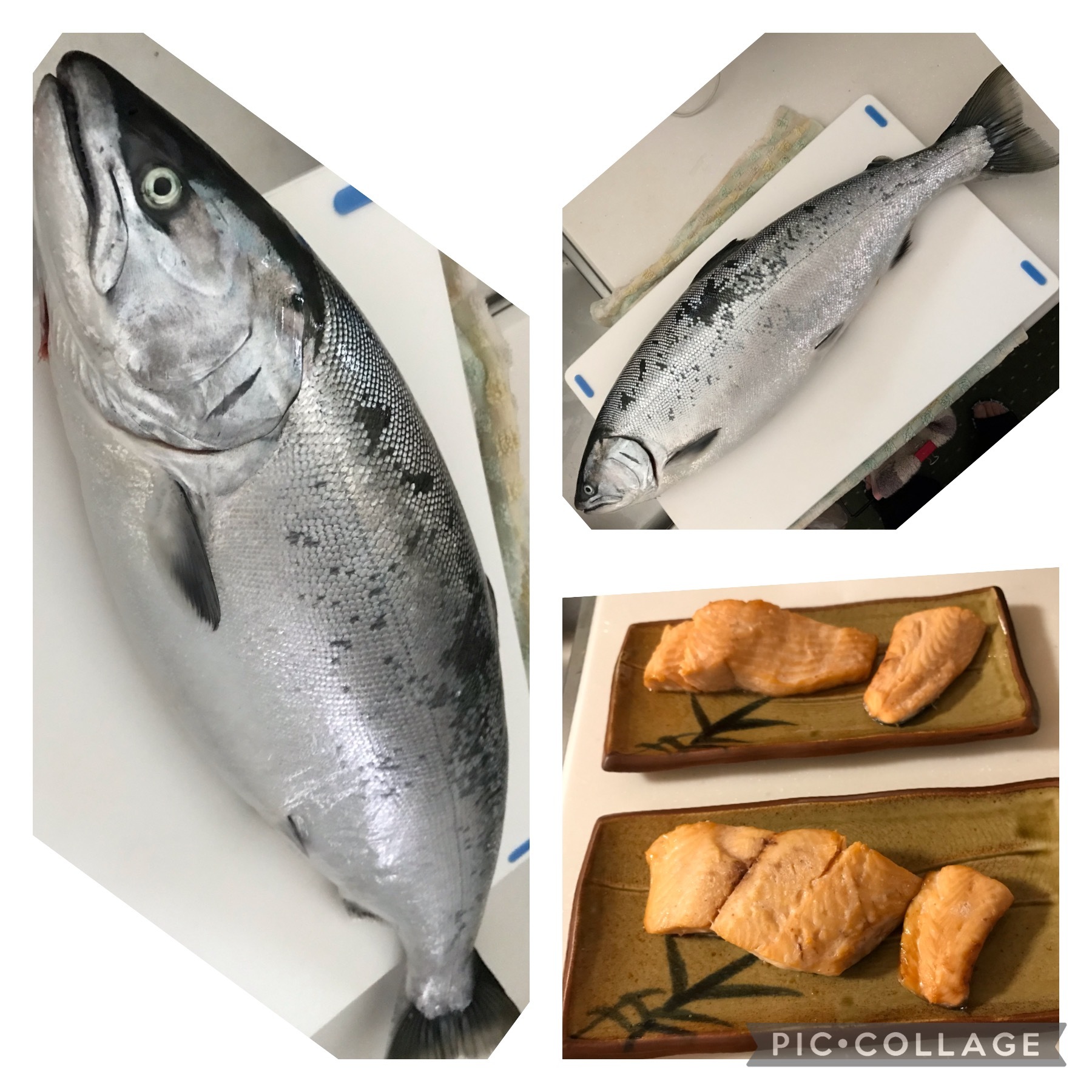 幻のサクラマスと聞いて、食べてみたくて注文してみました。体長約57センチの2.5キロ以上はあるかと思うサクラマスが届きました。マスって身と骨が柔らかいんですね。ウロコはカナダワシで優しくゴシゴシして取って、YouTubeの動画を見ながら捌いてみました。今までした事がない大名下ろしに苦戦しながら何とか捌き終わりました。初めて見るサクラマス。ヒレとかよくよく観察してみたのですが、かわいいヒレもありました。川魚の名残かな?顔もよく見るととても可愛いかったです😍