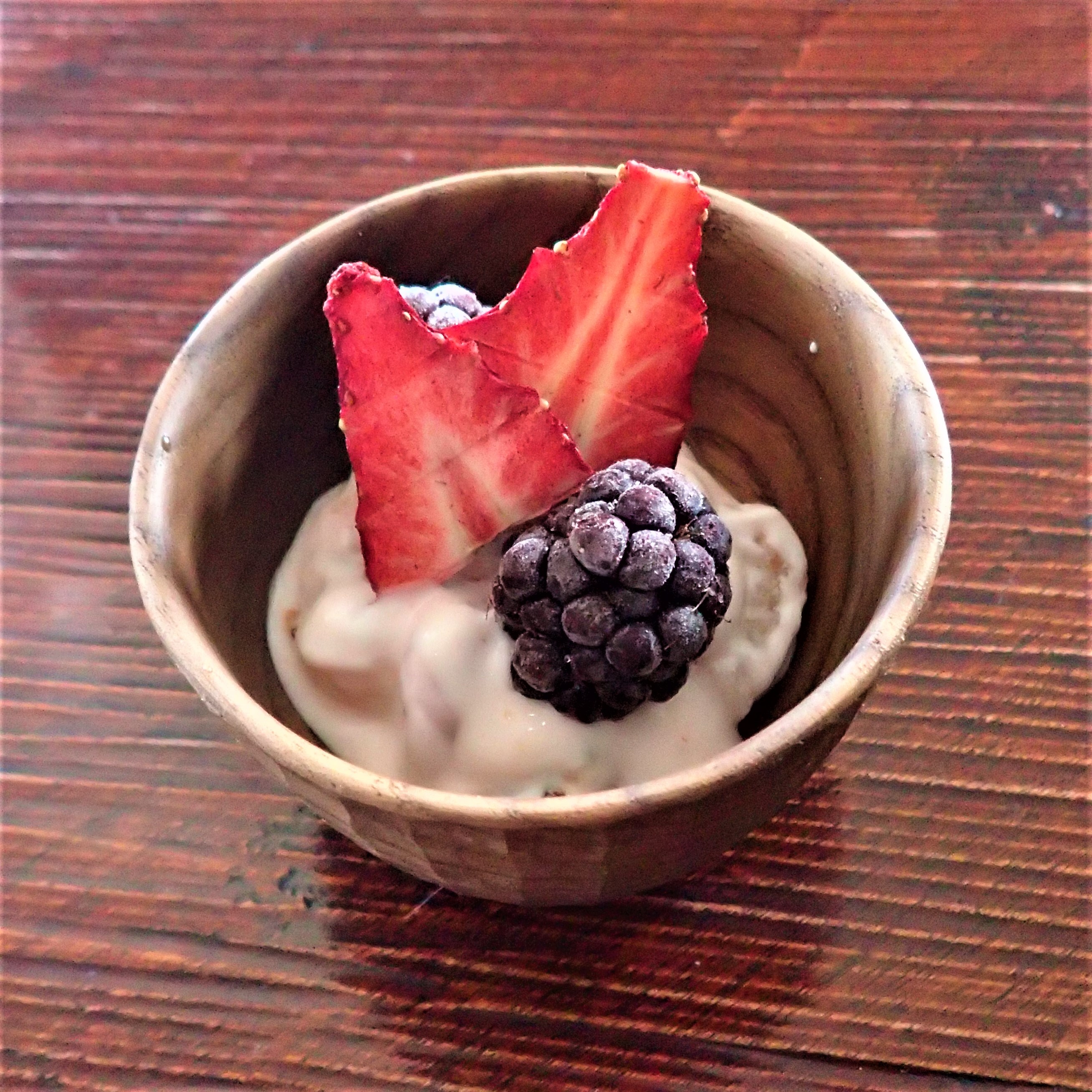 姉一家が遊びに来て、おやつにドライや生のフルーツを混ぜたヨーグルトを作ったので、アドベリーもその中に使わせていただきました。