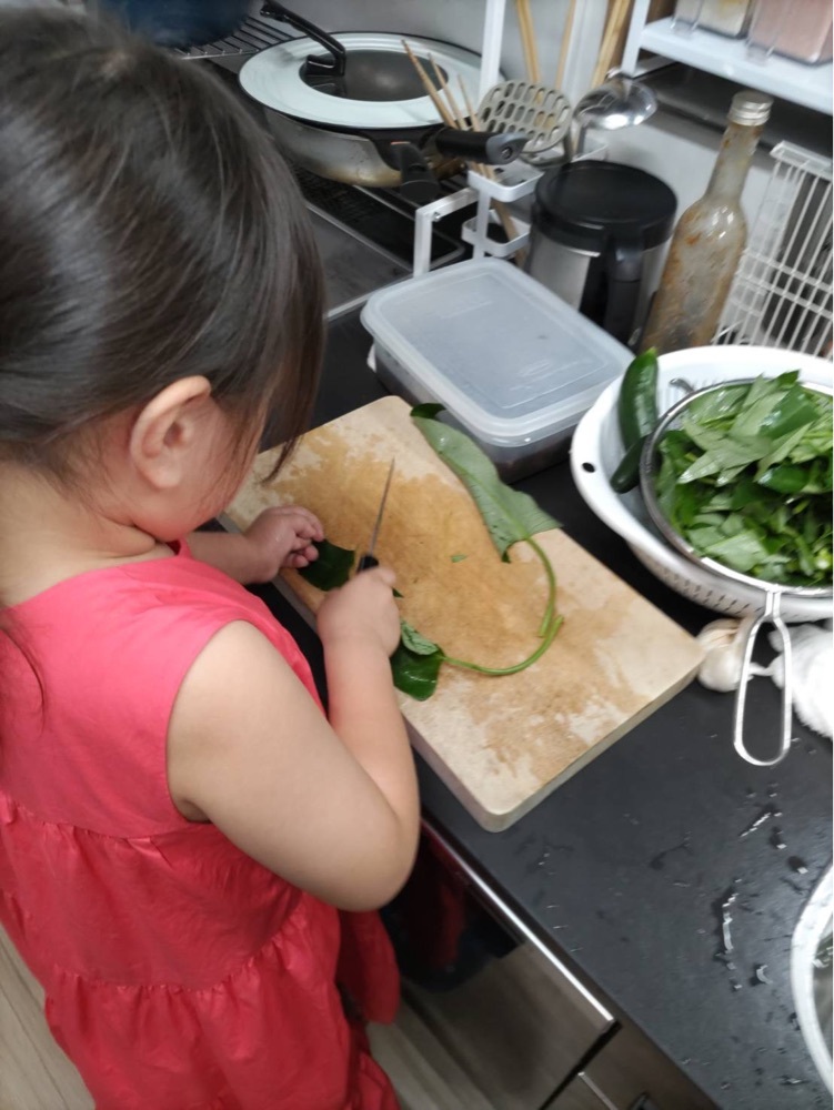 娘が🔪🍃🌱空芯菜を切ってくれて、私が炒める係♡♡