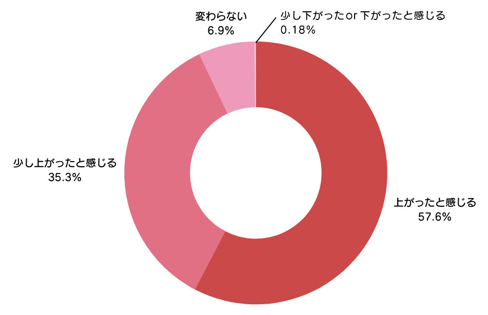 約9割近くの消費者が食料品の価格が上がったと感じているようです。 スーパーでの値上げ表記や、ニュースなどで資材高騰・気候変動などによる物価上昇が報じられていることで、昨今、価格の上昇を体感する機会が増えていることも要因になっていると考えられます。