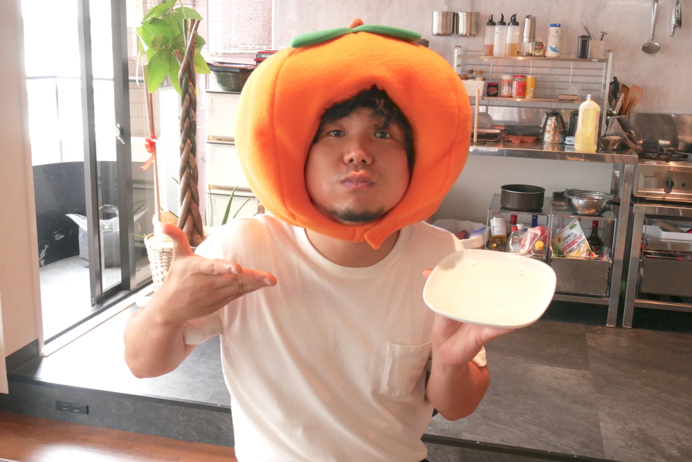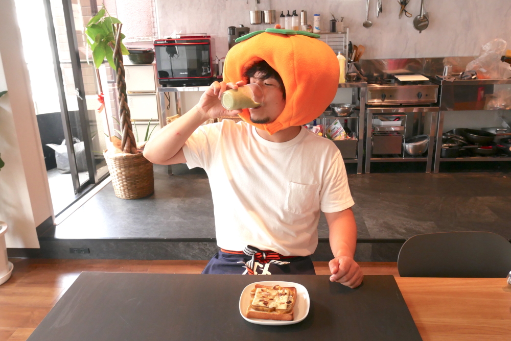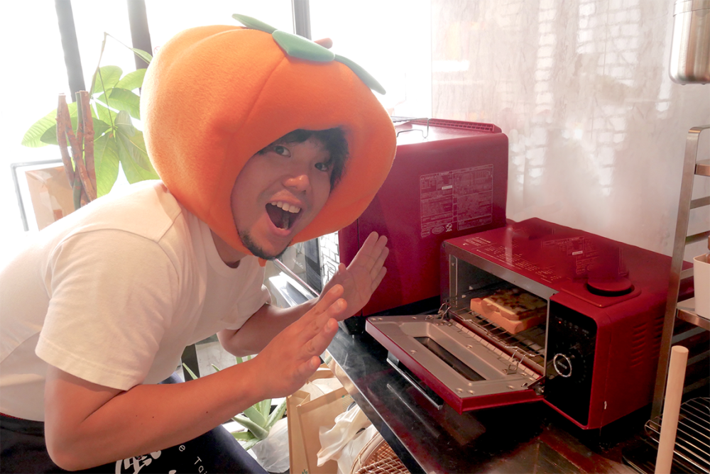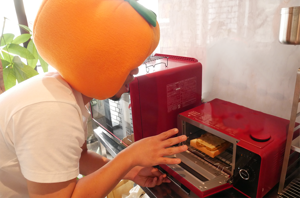 柿チャレンジ1日目、トースターの前で喜んでいる柿マンがいました。