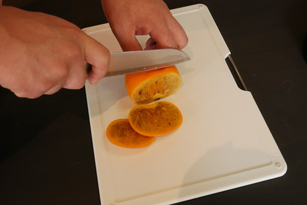スライスする柿は、硬めがおすすめ。スライスしてから皮を剥くと、手がぬめぬめしなくて剥きやすいよ