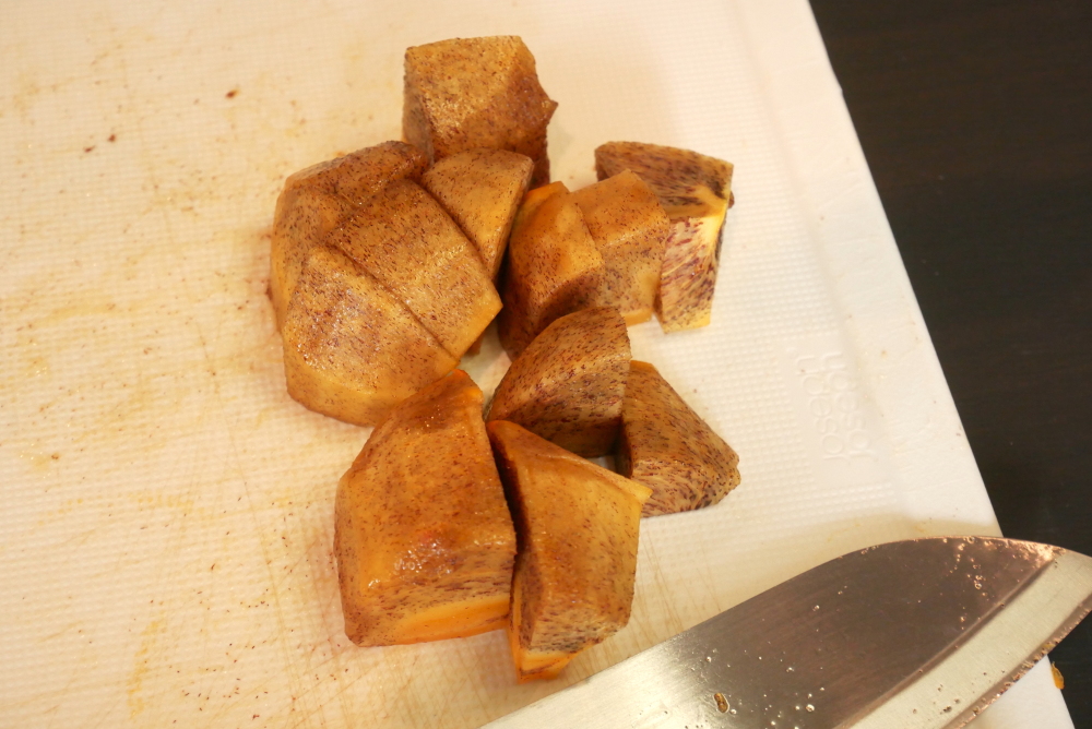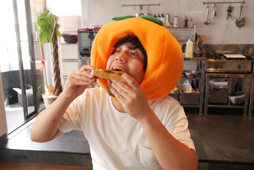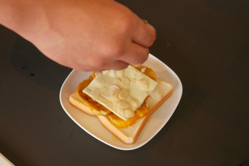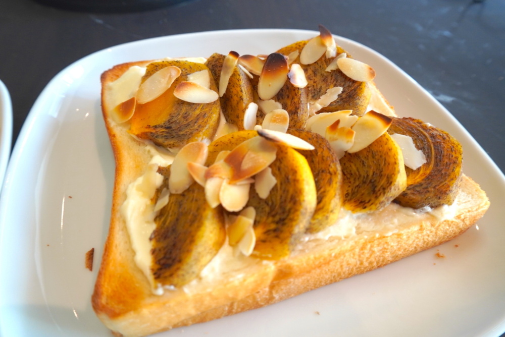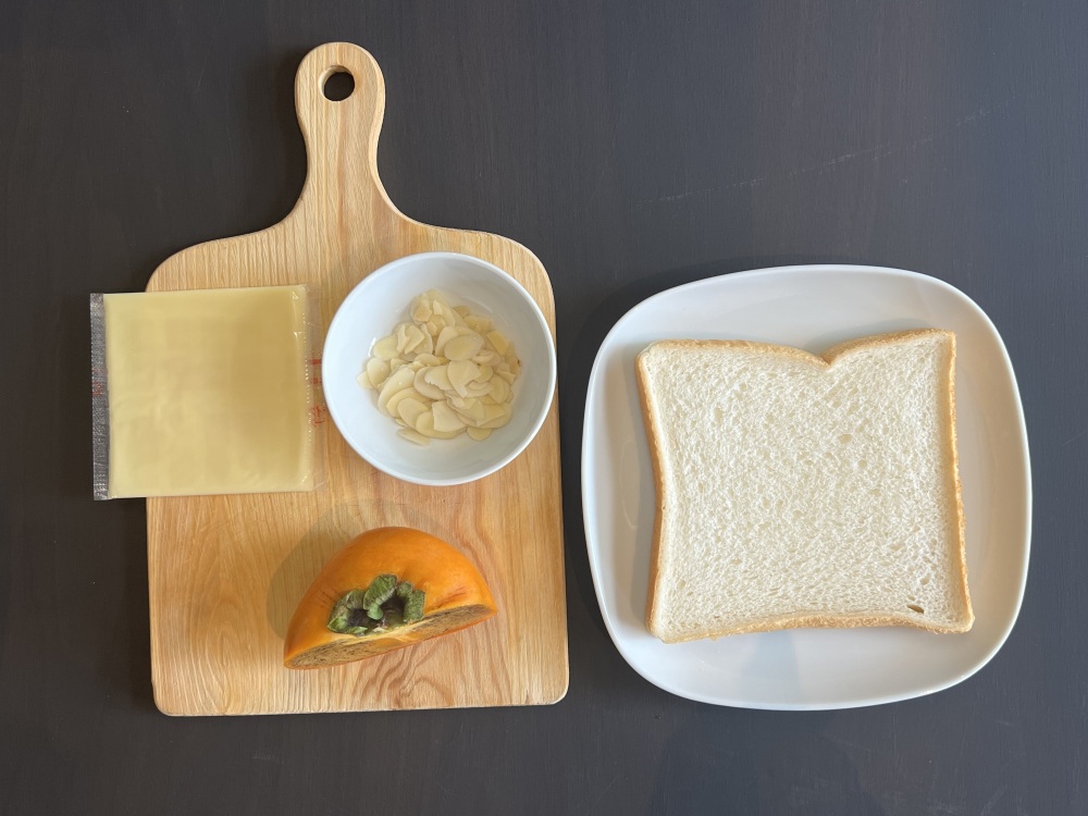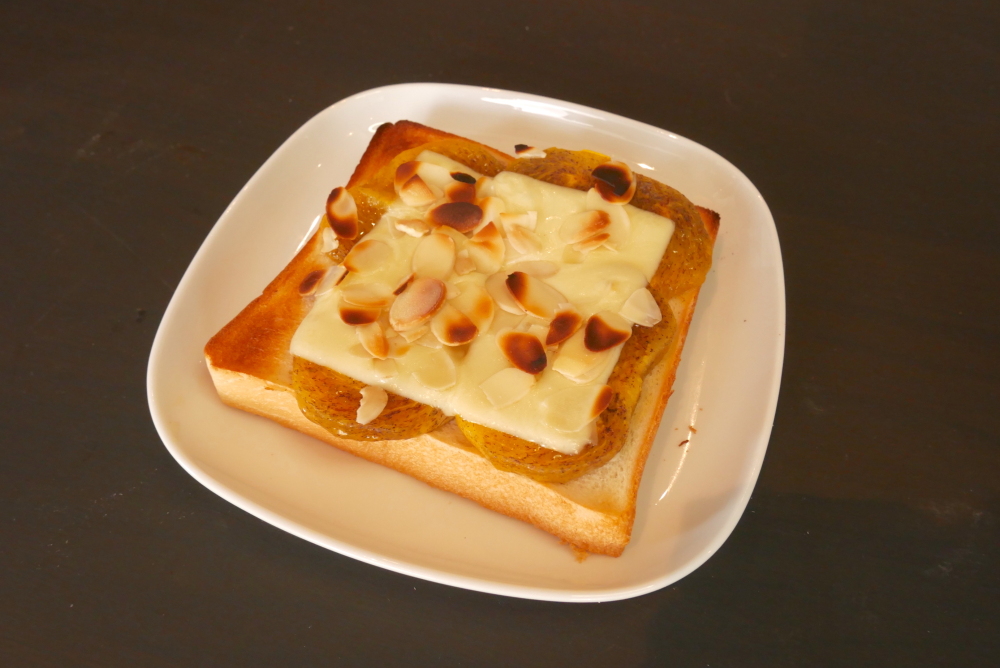 ごちそうさまでした。次は、柿トースト。焼いている時から、アーモンドの香ばしさが漂ってきたよ