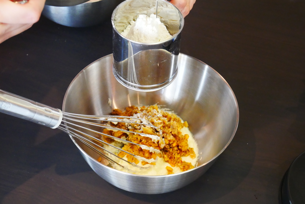 ④泡立てた卵白に②を加え、Aの粉を合わせてふるい入れる。泡立て器からヘラに持ち替え、ヘラで切るように混ぜ合わせる