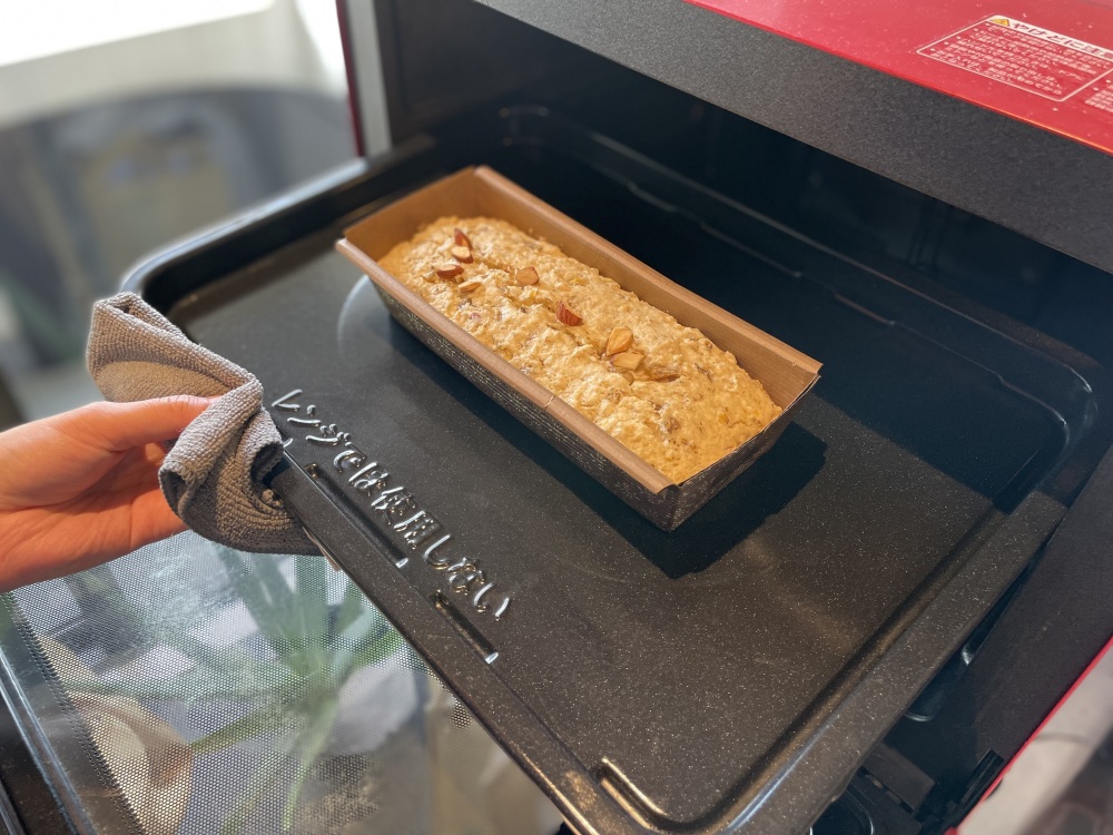 1回目と2回目の間に、焼ムラがでないようケーキの向きを入れ替えてあげるといいよ。熱いから気をつけてね!