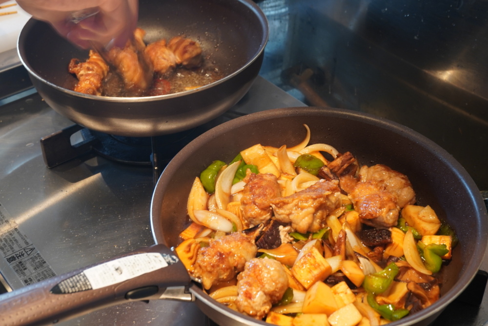 ④野菜に②のあんを入れて一煮立ちさせ、揚げたての豚肉を投入する