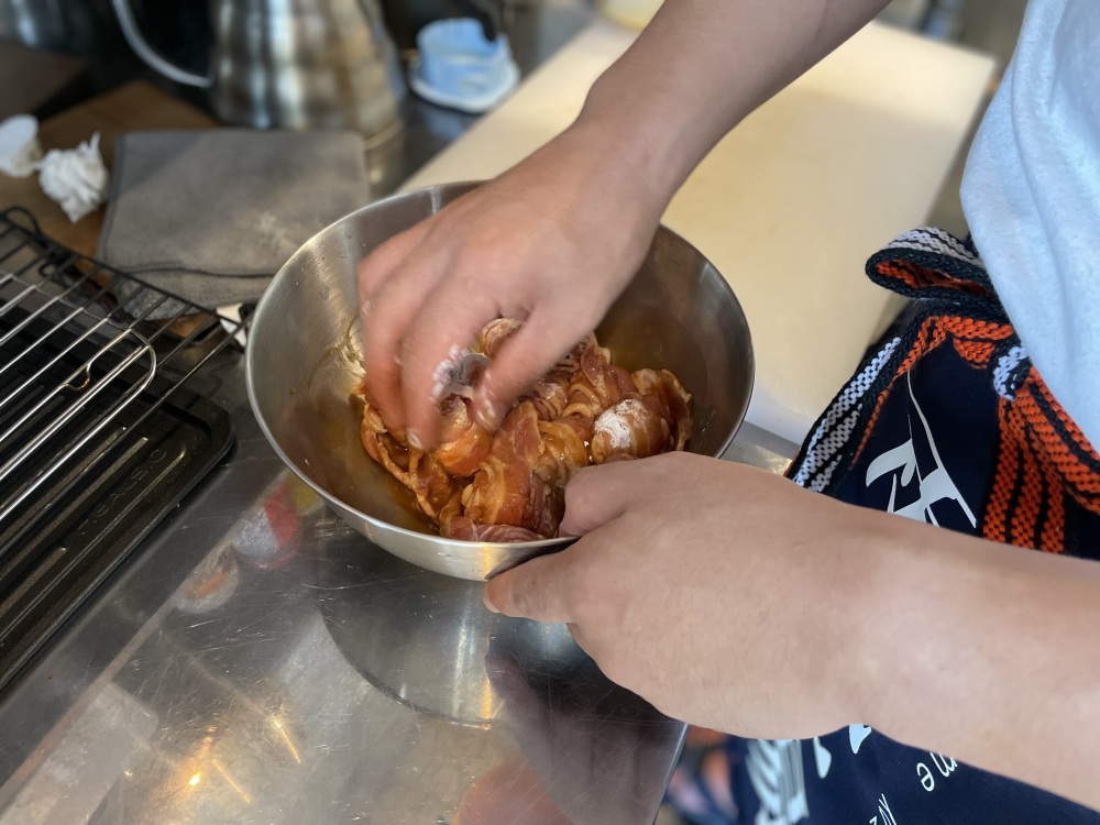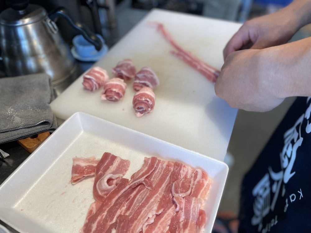 ①豚肉をくるくる巻き、Aの醤油・酒で下味をつける。次に、Aの溶き卵と片栗粉を豚肉に絡ませる。