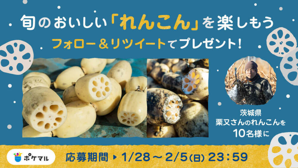 ポケマル公式Twitterをフォローして、対象のツイートをリツイートした方の中から、抽選で10名様に栗又さんのれんこんをプレゼントします!