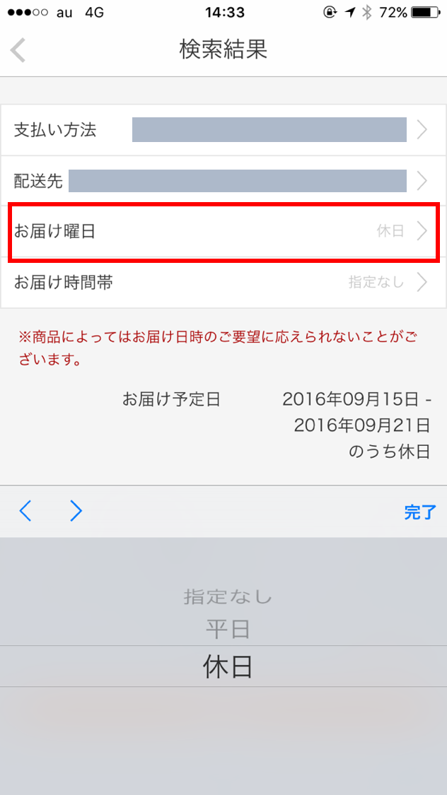 ③商品を購入する際に、お届け日を開催日に合わせて「平日」または「休日」で指定します。