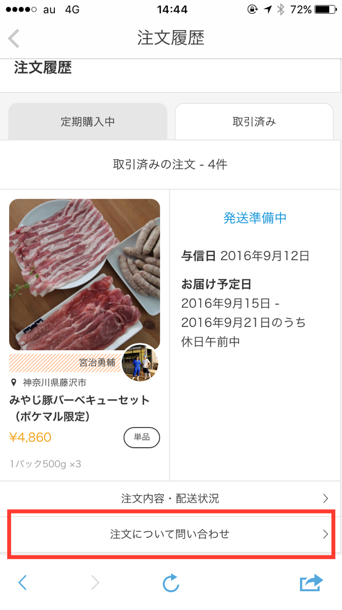 ④購入完了後、「注文について問い合わせ」から、念のため生産者さんに連絡をします。