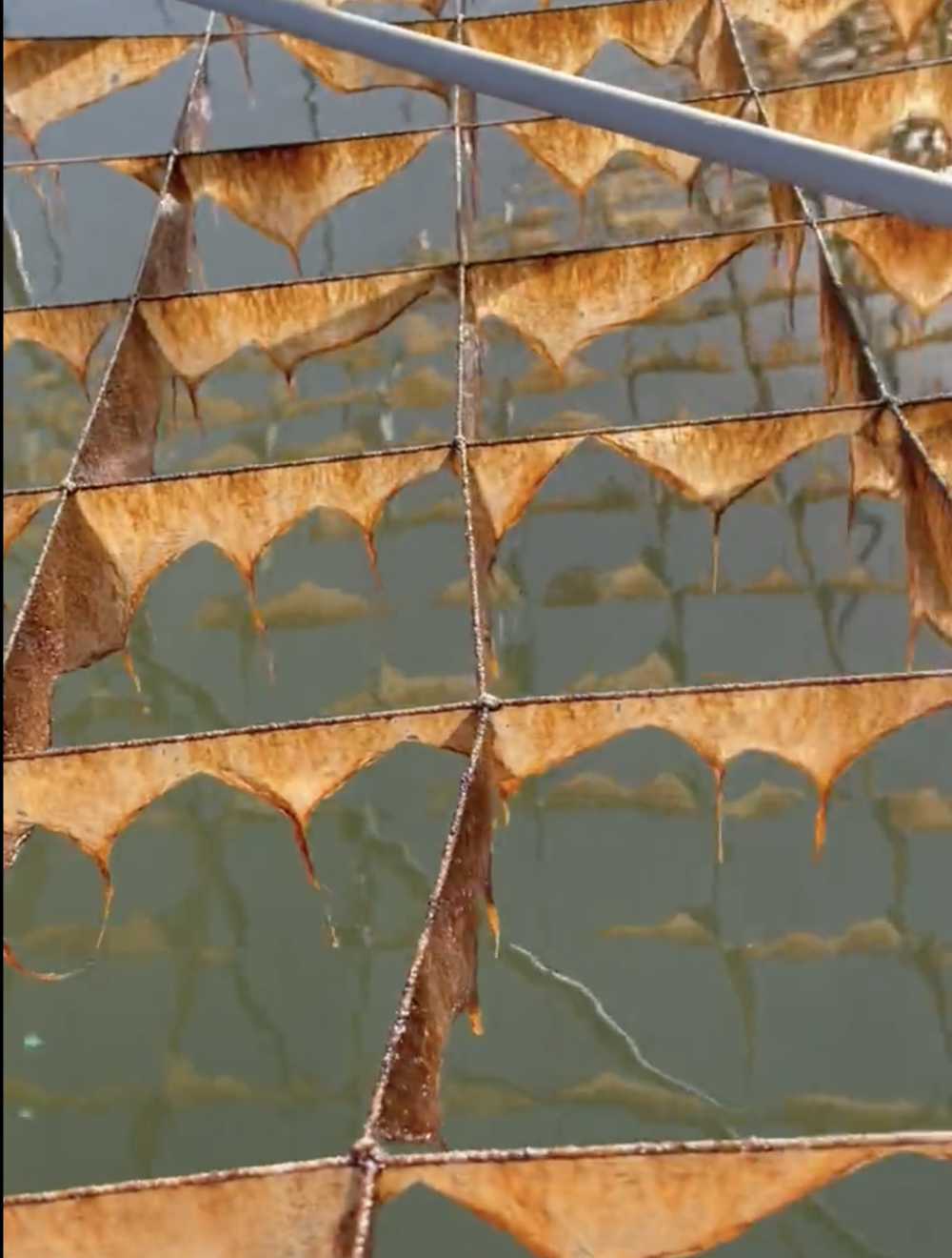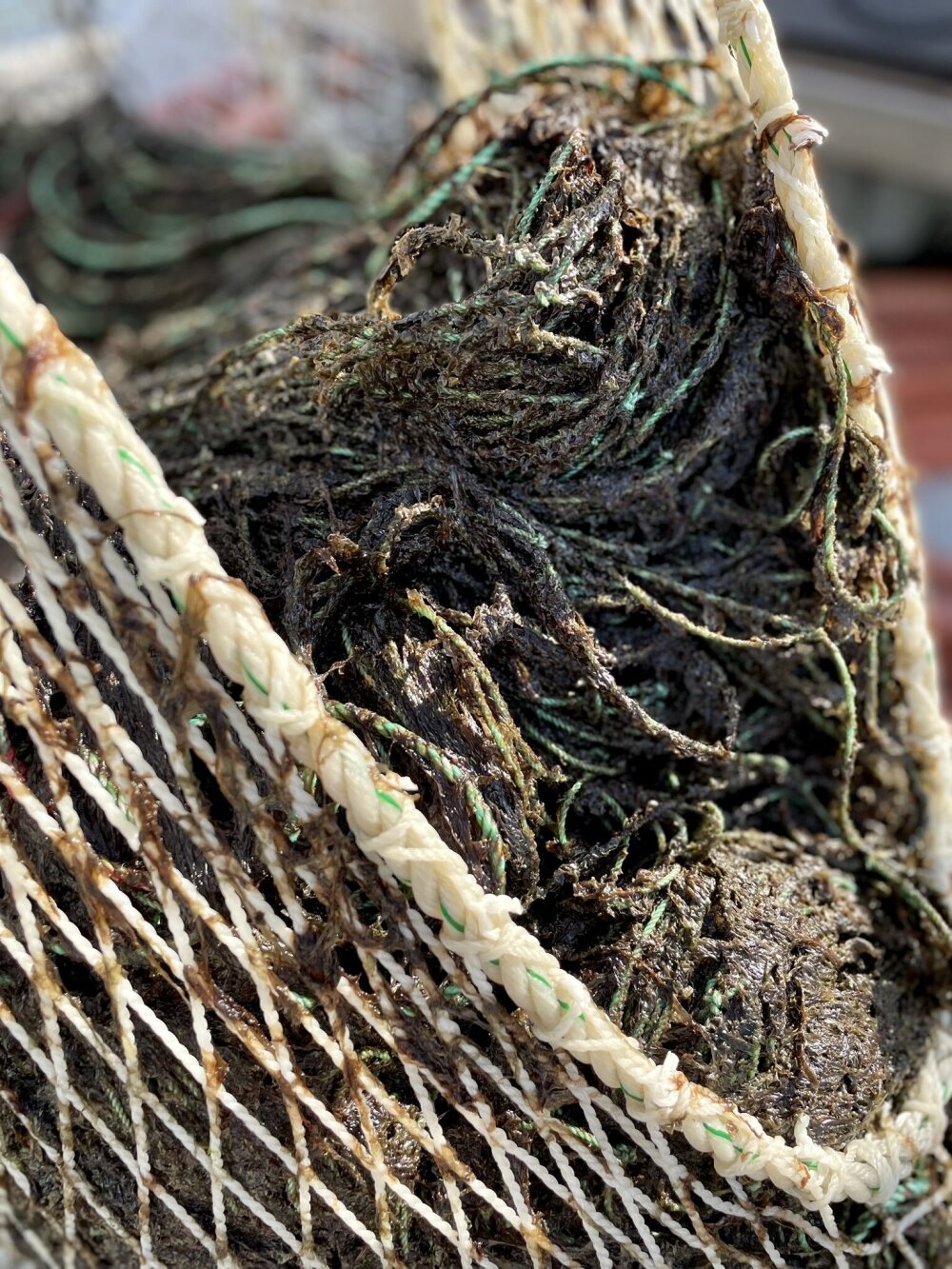 「ずっと風が続いてなかなかはかどらなかった、壊滅した漁場の海苔網回収完了。網を片付ける時は通常海苔を根こそぎ刈り採ってから撤去するけど、刈り採れる状況ではないから海苔が付いたまま回収。すごく重かった。順調であれば、この海苔網からあと数回収穫できたのにな。初摘みだけで生産不能に。」