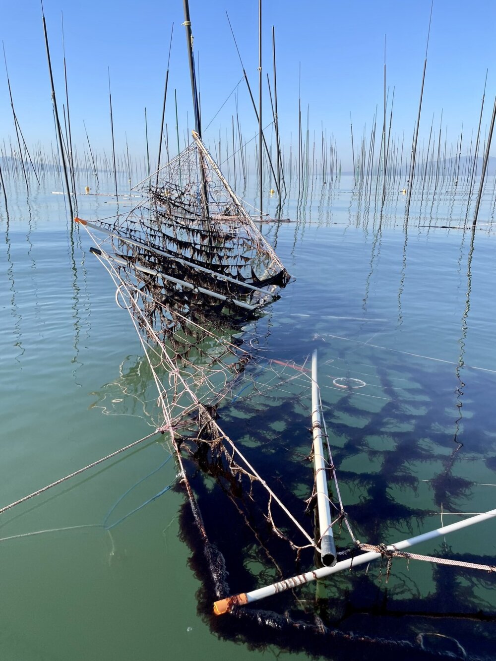 通常は海苔網が整然と並んでいるはずなのだが、海苔網が支柱を飛び越え、網が絡まったりして、網が綱になりました。