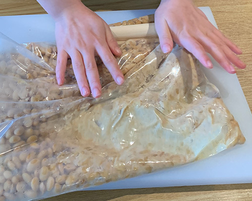豆をつぶす感触も楽しいし、袋の中で潰せるから片付けも少なくて済むのもいいね。