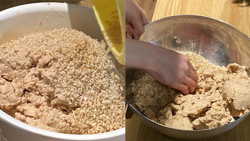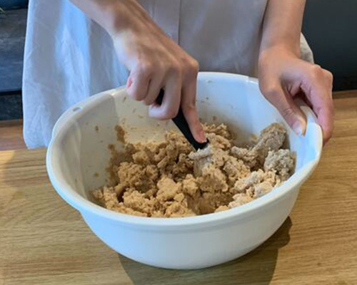 まずは糀と塩を混ぜ、まんべんなく混ざったら、潰した豆を加えていきます。ボソボソ感が強かったら、大豆の茹で汁を少しずつ加えながら水分を補って。 みその総量よりも容量が大きい、ホーロー容器やバケツなどがあるといいですよ。