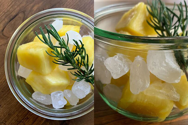 砂糖が溶けてパイナップルが上がってきたら、お好みでローズマリーをひとつまみ加え、翌日にパイナップルとハーブを取り出し完成です✨