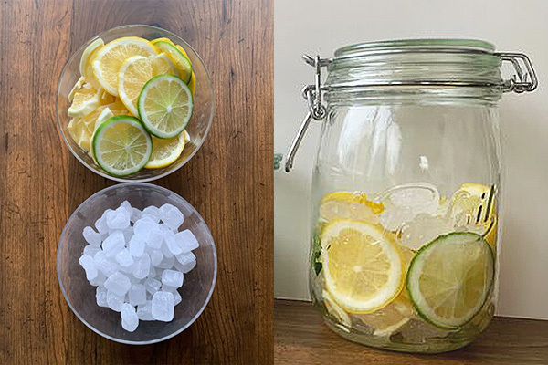 レモンとライムを2mm〜3mmの輪切りにして1:1で砂糖と交互に瓶に詰めるだけ。